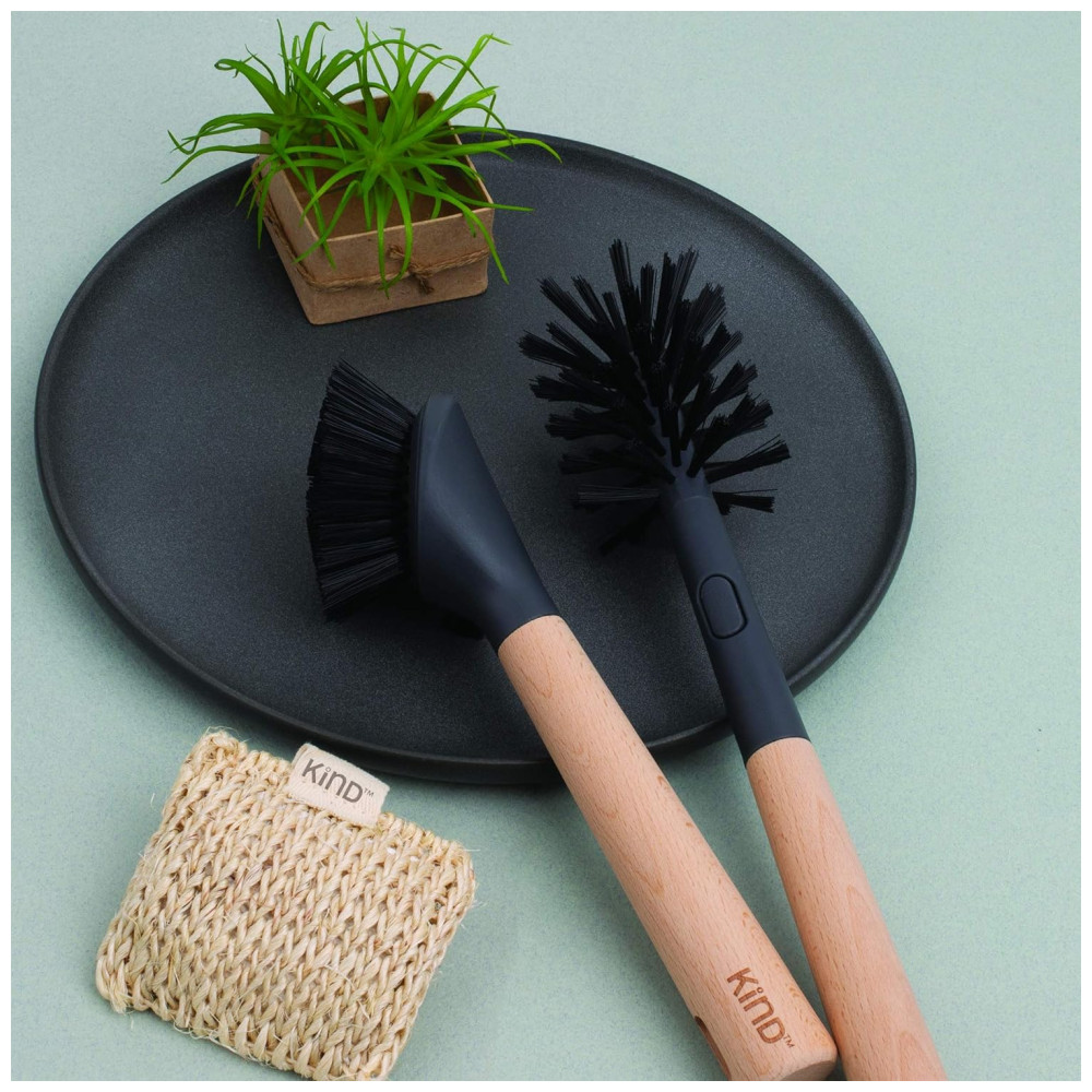 A coleção Kind da Casabella inclui uma variedade de esponjas, escovas e acessórios. Cada peça da coleção é feita com materiais 100 vegetais, além de outros materiais, incluindo madeira de faia certificada FSC e plástico reciclado. Sem cores artificiais ou corantes químicos. As esponjas são feitas com materiais 100 vegetais, com materiais como bucha, celulose, cânhamo, algodão, agave. Sem cores artificiais ou corantes químicos, costurados à mão, sem cola.