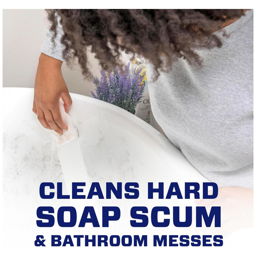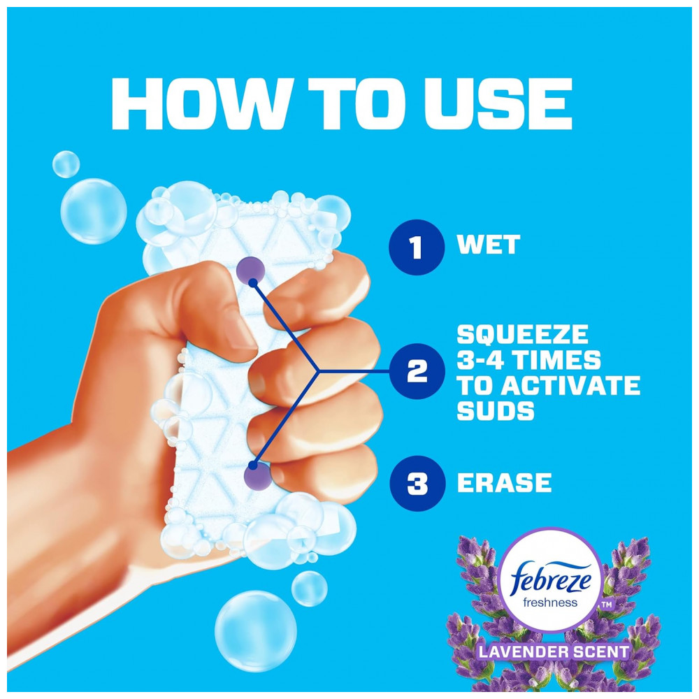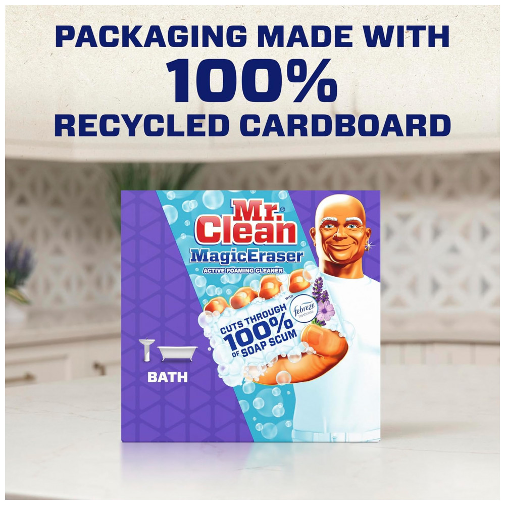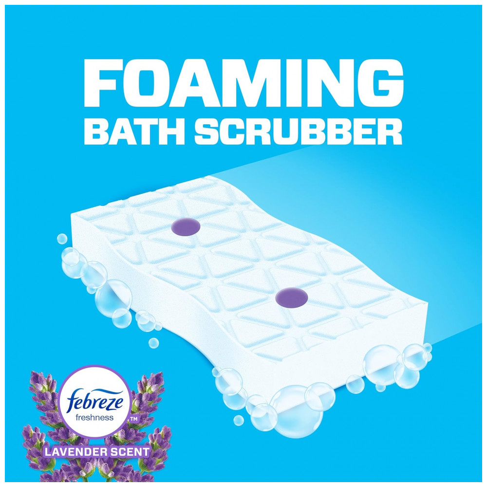 O esfregão de banho Mr. Clean Magic Eraser com perfume Febreze Lavender apaga 3x mais espuma de sabão em comparação com o limpador de spray multifuncional líder