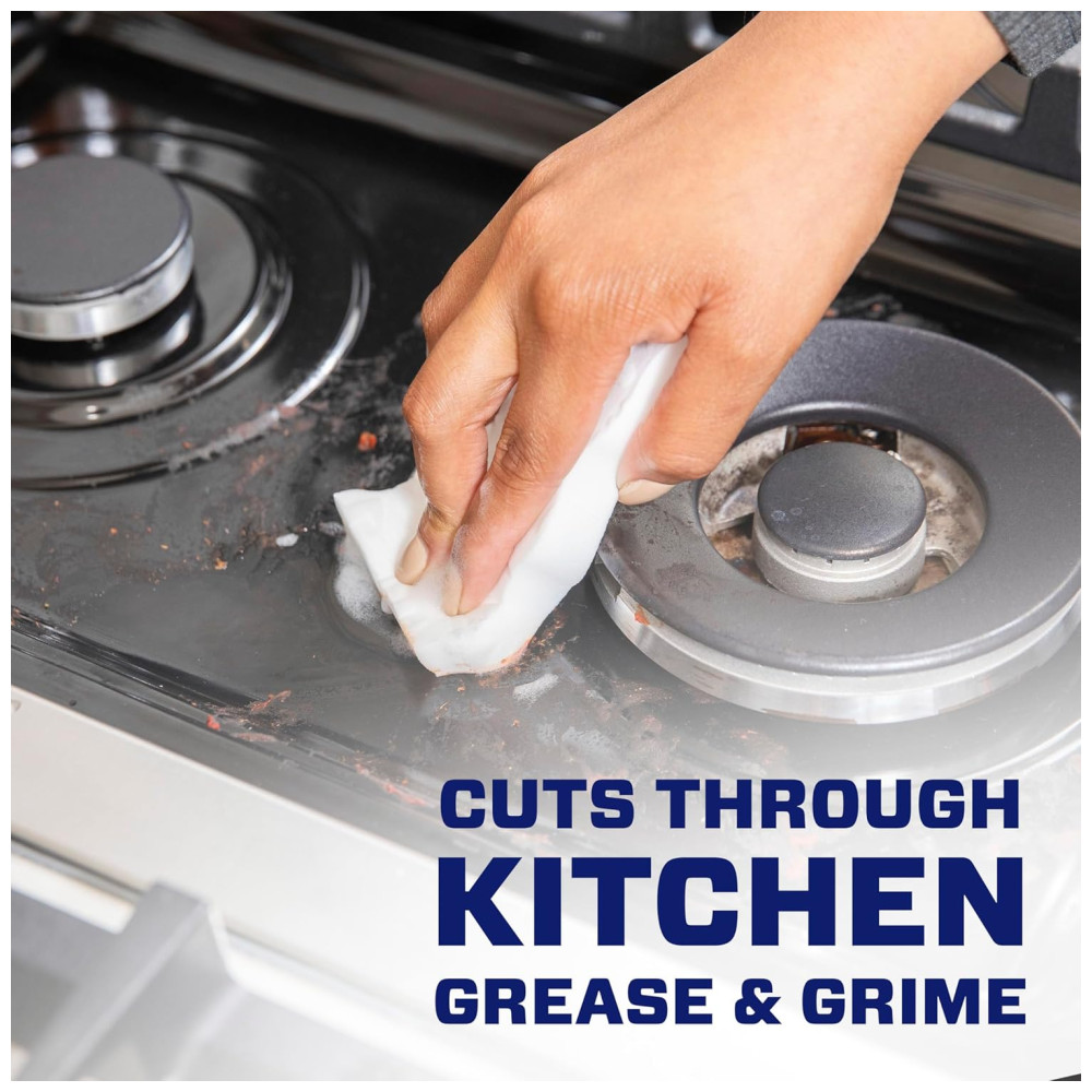 O esfregão Mr. Clean Magic Eraser Kitchen com Dawn remove 3 vezes mais sujeira gordurosa da cozinha por passagem do que o limpador de spray de alvejante multiuso líder