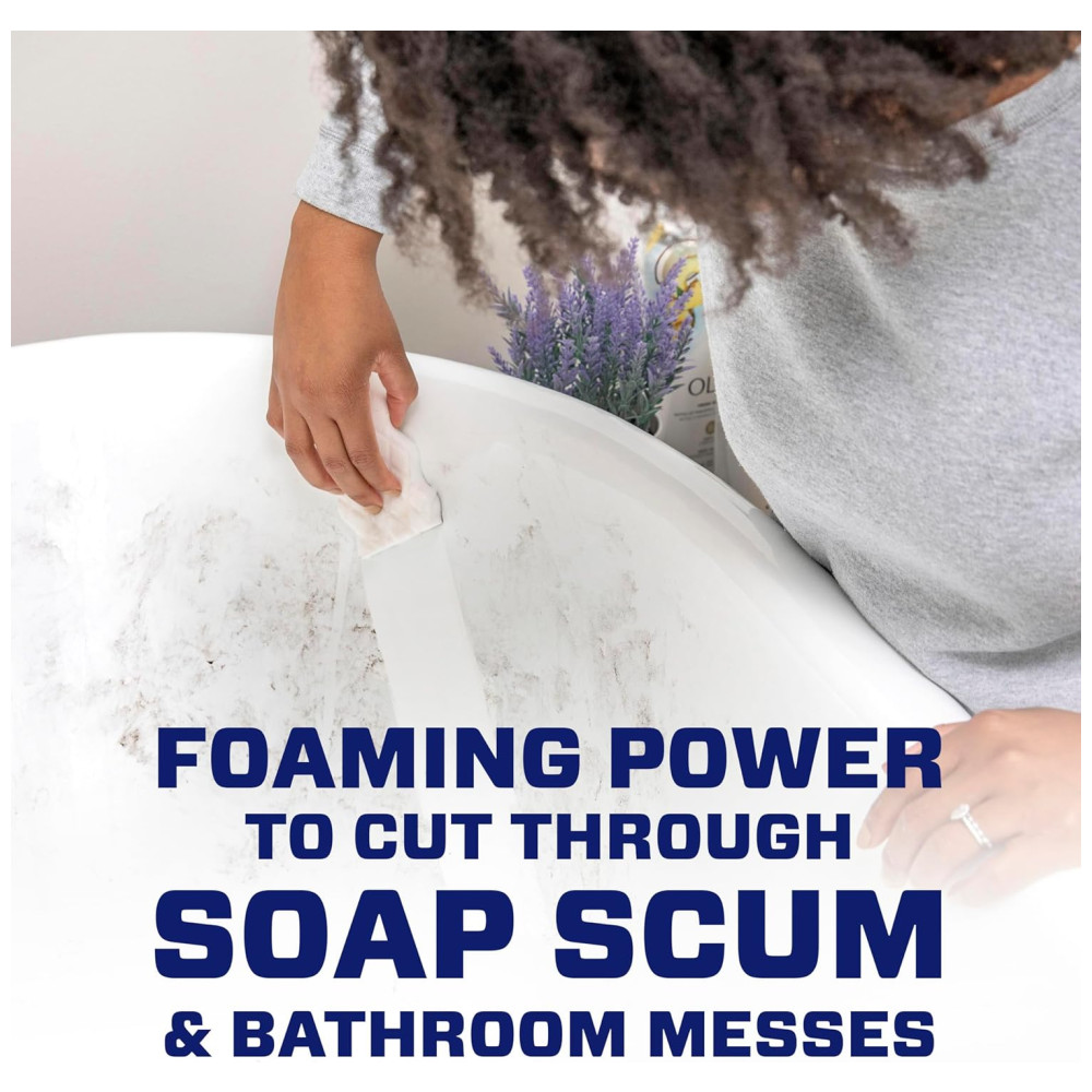 Mr. Clean Magic Eraser Bath com Febreze Freshness Lavender Scent apaga 3 vezes mais espuma de sabão em comparação com o limpador de spray alvejante para todos os fins.