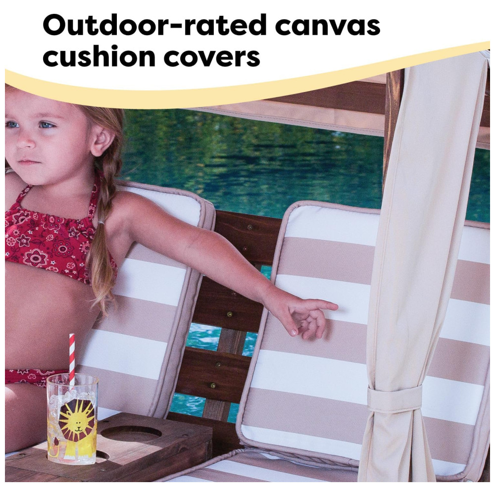 A KidKraft Double Chaise Lounges é perfeita para seus filhos relaxarem em dias quentes de verão. Com um dossel de três lados para proteção solar, há espaço suficiente para dois amigos ou até mesmo para a mamãe e o papai se juntarem. A espreguiçadeira possui porta copos embutidos para bebidas geladas ou lanches, além de um compartimento de armazenamento oculto para óculos de sol ou brinquedos. Construída com madeira premium e durável tratada para repelir água, a KidKraft Double Chaise Lounges é resistente às intempéries e manterá sua ótima aparência em todas as estações. Cada assento comporta até 38,55 quilos e é recomendado para maiores de 3 anos. A montagem leva aproximadamente uma hora para cada pessoa e o mobiliário de madeira para pátio apresenta cores e padrões que combinam com o estilo do seu quintal.