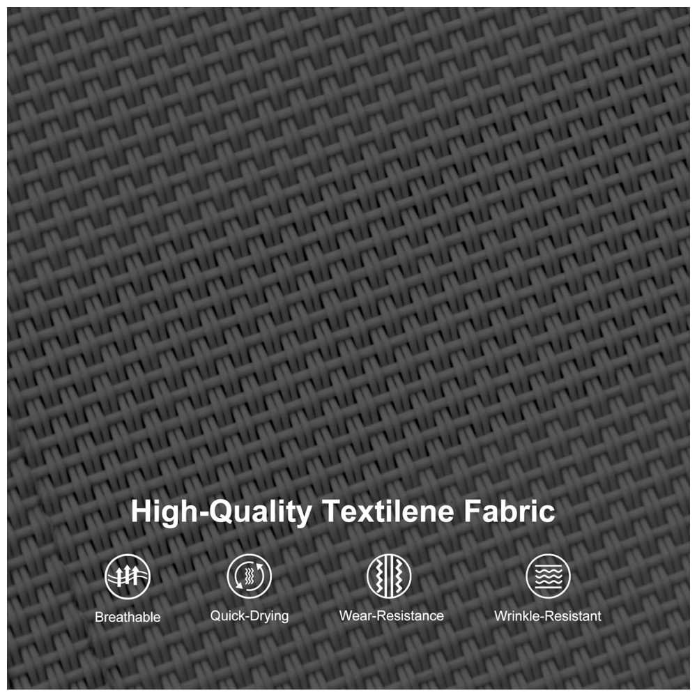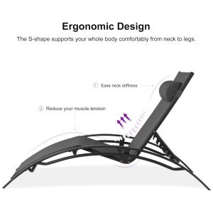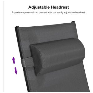Este conjunto inclui duas espreguiçadeiras e uma mesa, perfeito para desfrutar do ar livre. As espreguiçadeiras possuem um tecido Textilene durável que é respirável, resistente aos raios UV e repelente à água, além de secar rapidamente. A estrutura de alumínio com acabamento de alta qualidade é à prova de ferrugem e suporta até 136,05 quilos. A cadeira é leve e resistente, empilhável e possui 5 posições ergonômicas ajustáveis para reduzir a tensão muscular. O design em formato S é confortável e moderno, adequado para qualquer ambiente externo. O conjunto é fácil de montar e manter, e possui apoios de braço e cabeça ajustáveis para um banho de sol perfeito.