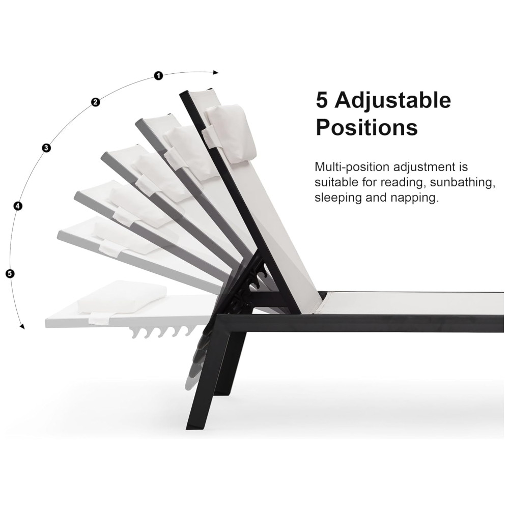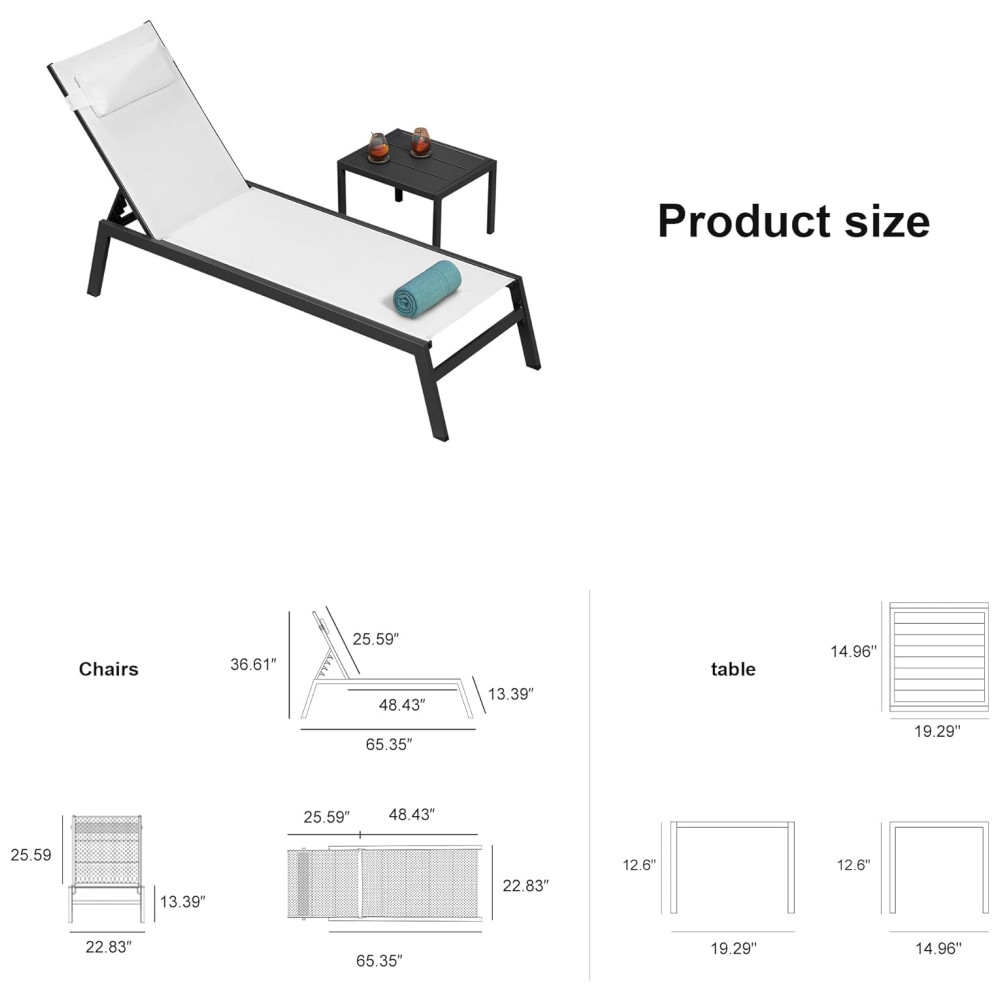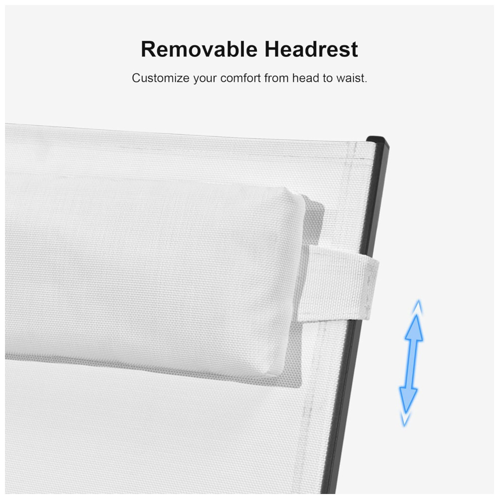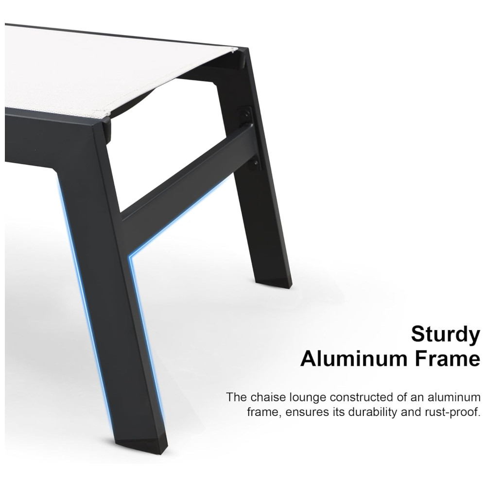 A espreguiçadeira possui uma estrutura resistente feita de alumínio com revestimento, o que garante durabilidade e resistência às intempéries e à ferrugem. As pernas possuem almofadas antiderrapantes na parte inferior para aumentar a estabilidade e segurança. O tecido Textilene atualizado é resistente aos raios UV, não desbota facilmente e seca rapidamente, além de não requerer manutenção frequente. A almofada de encosto é ajustável em 5 posições e o travesseiro removível pode ser utilizado para relaxar o pescoço, os ombros ou as costas. O design minimalista adiciona um toque moderno ao ambiente externo, tornando a uma opção perfeita para locais como a praia, varanda, quintal, piscina, entre outros. A capacidade de peso é de 124,72 quilos. A montagem é simples e inclui instruções claras e todo o hardware necessário.