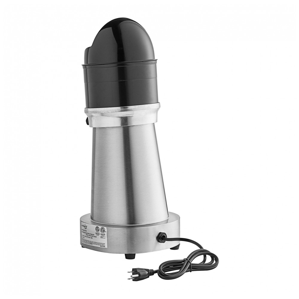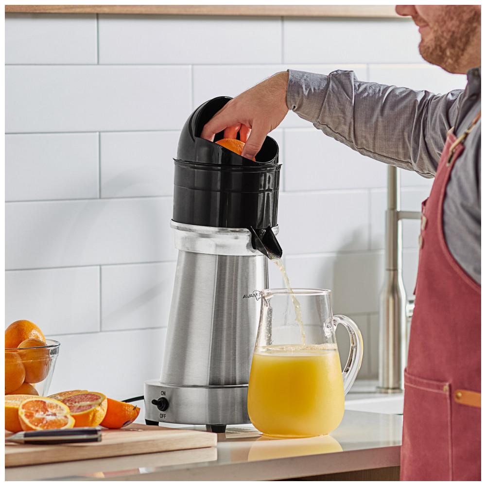 Espremedor cítrico elétrico AvaMix CJ1400 em aço inoxidável prateado processa frutas cítricas pequenas, médias e grandes com 3 reamers intercambiáveis e motor de 1.400 RPM. Operação via interruptor on/off com conexão 120V, produz suco filtrado por guarda-polpa e folga de bico de 24,8 cm para jarros ou copos. Indicado para uso em balcões de bar ou cozinha comercial com alimentação manual.