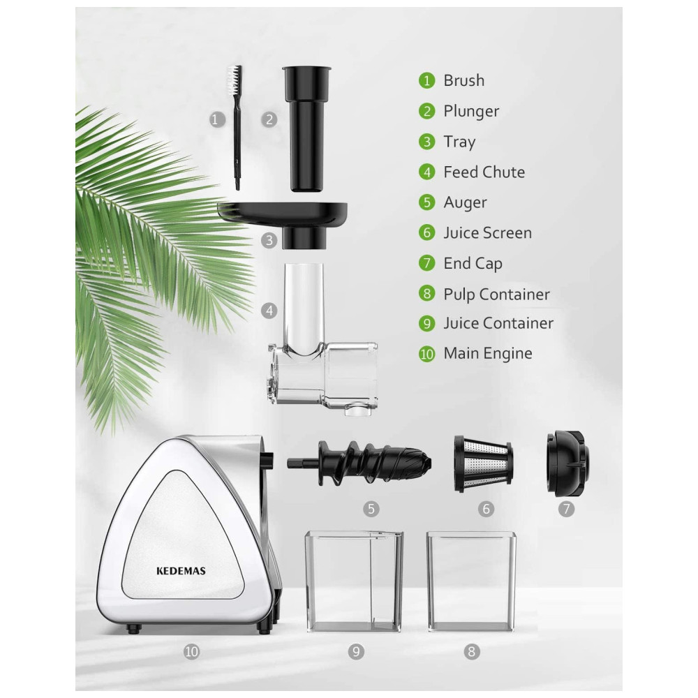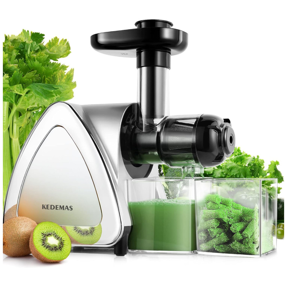 Extrator de Sucos Portátil KEDEMAS Silver 150W 110V Inox Espiral Lenta Reverso Antirresíduo Baixo Ruído Fácil Limpeza Desmontável