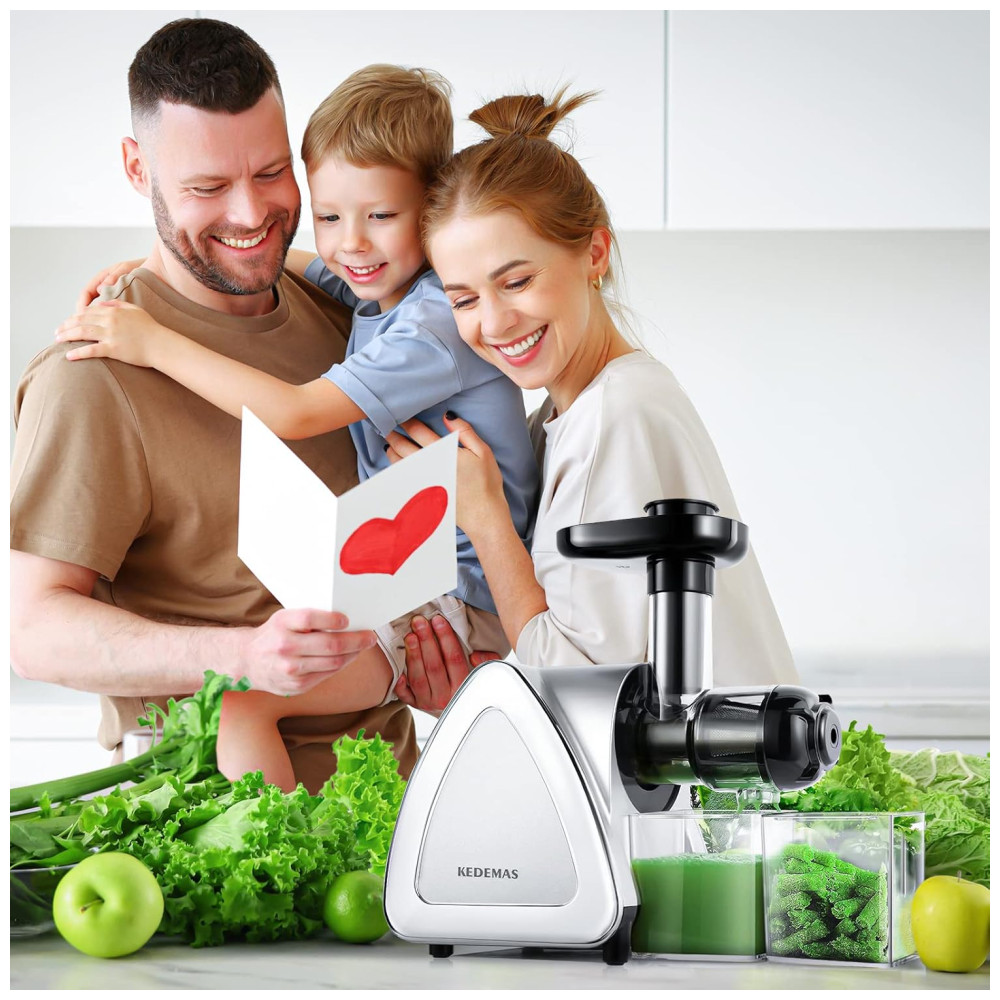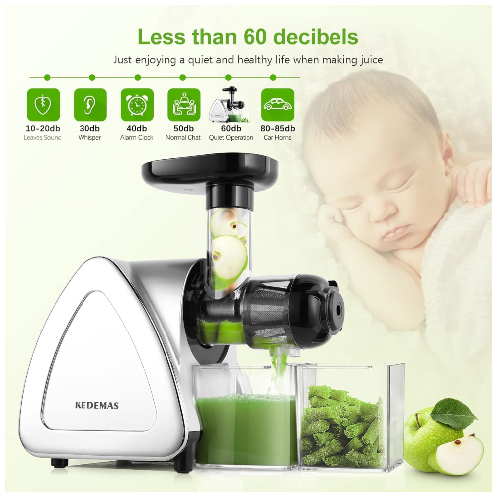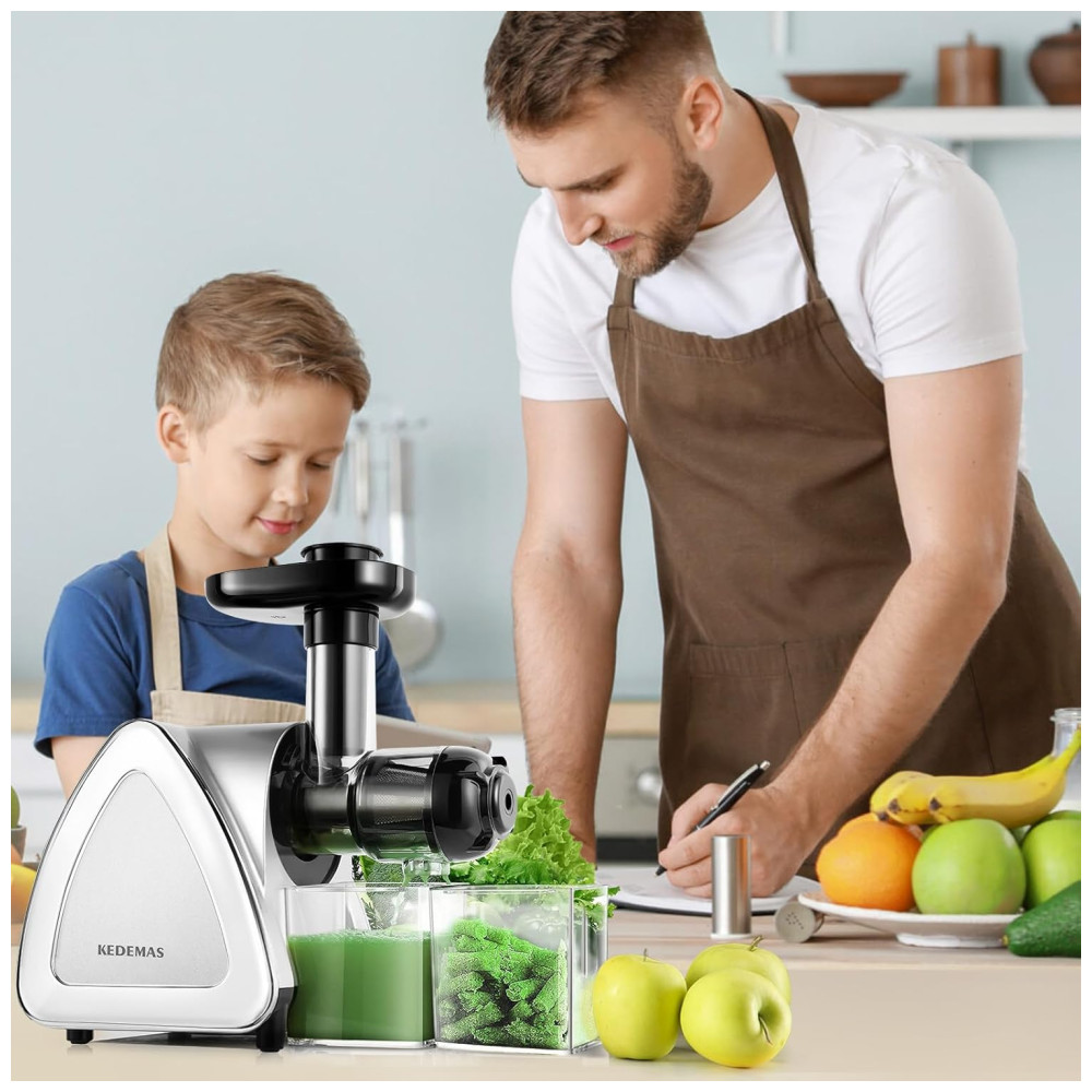 O extrator de sucos portátil KEDEMAS utiliza sistema de prensagem lenta a 80 rpm com espiral de 7 segmentos, permitindo extração eficiente de frutas, legumes e verduras, separando integralmente suco e polpa. Com potência de 150 W e funcionamento em 110V, opera silenciosamente (<60 dB), sendo indicado tanto para uso matinal quanto em ambientes que requerem baixo ruído.
