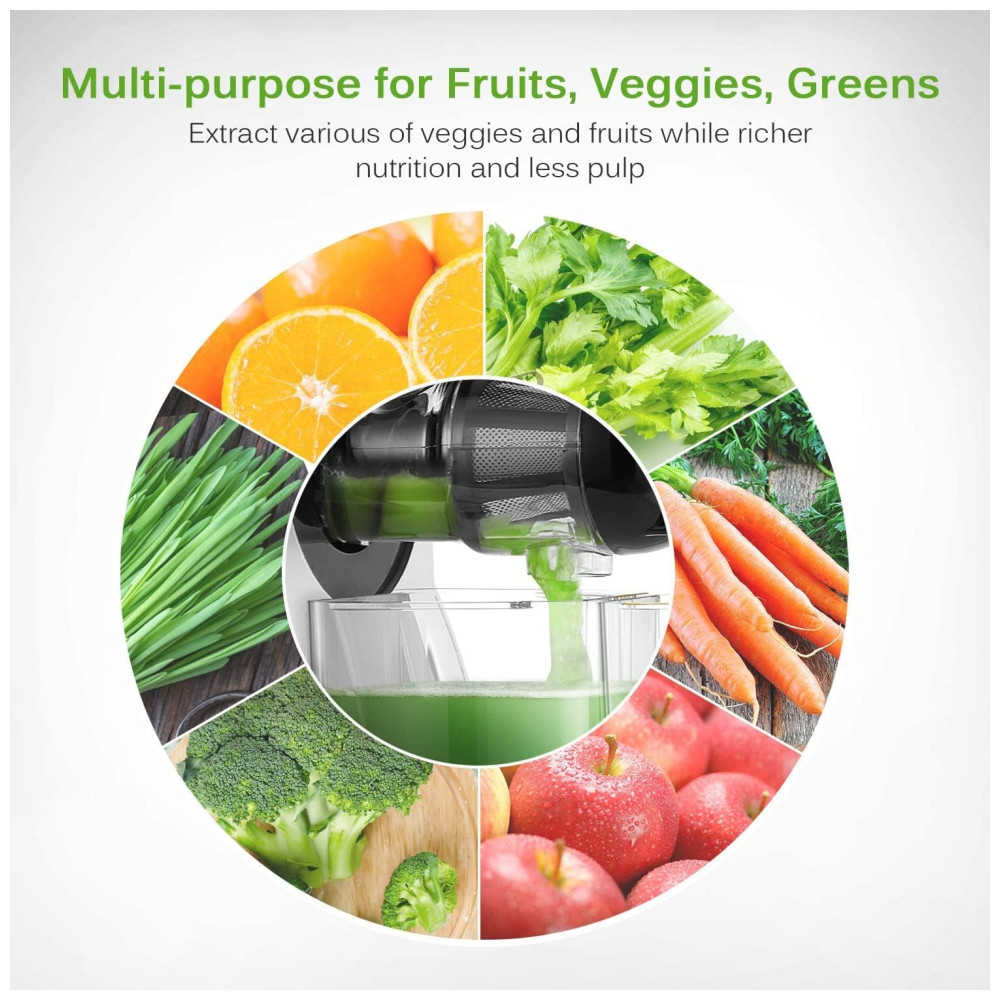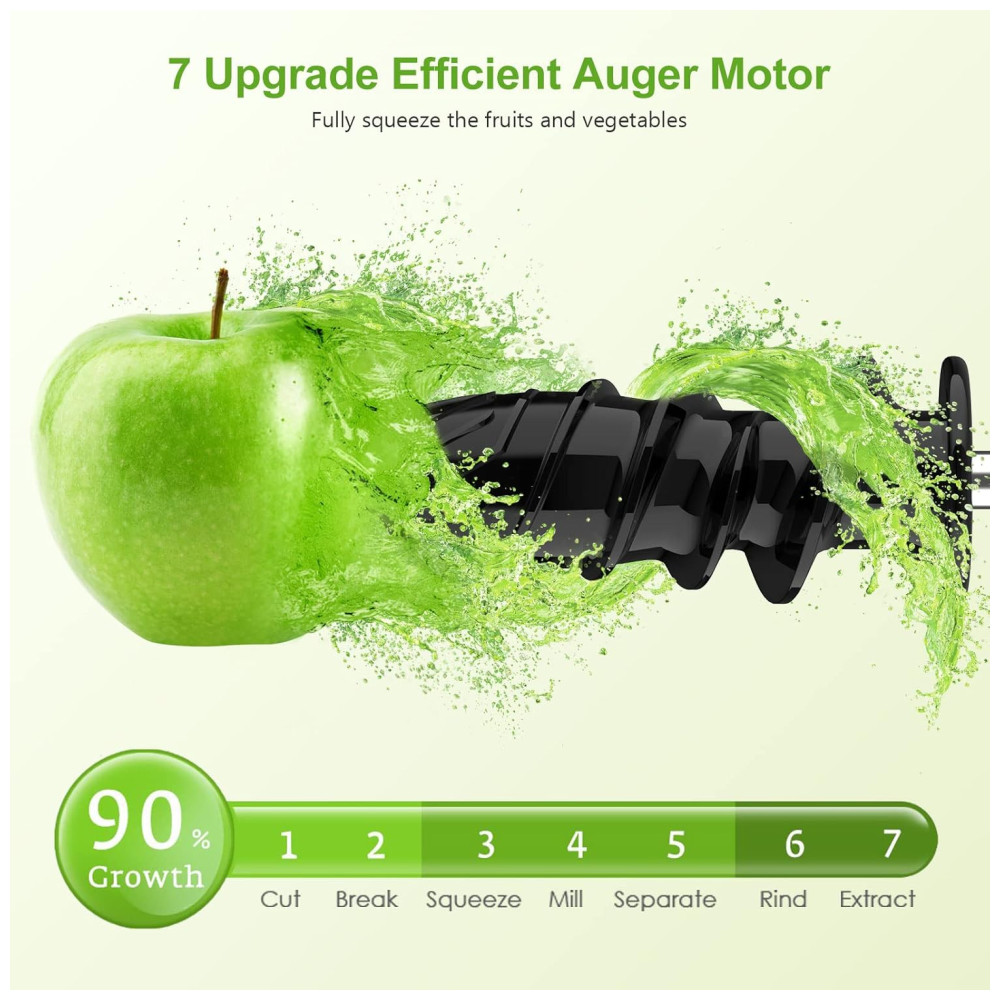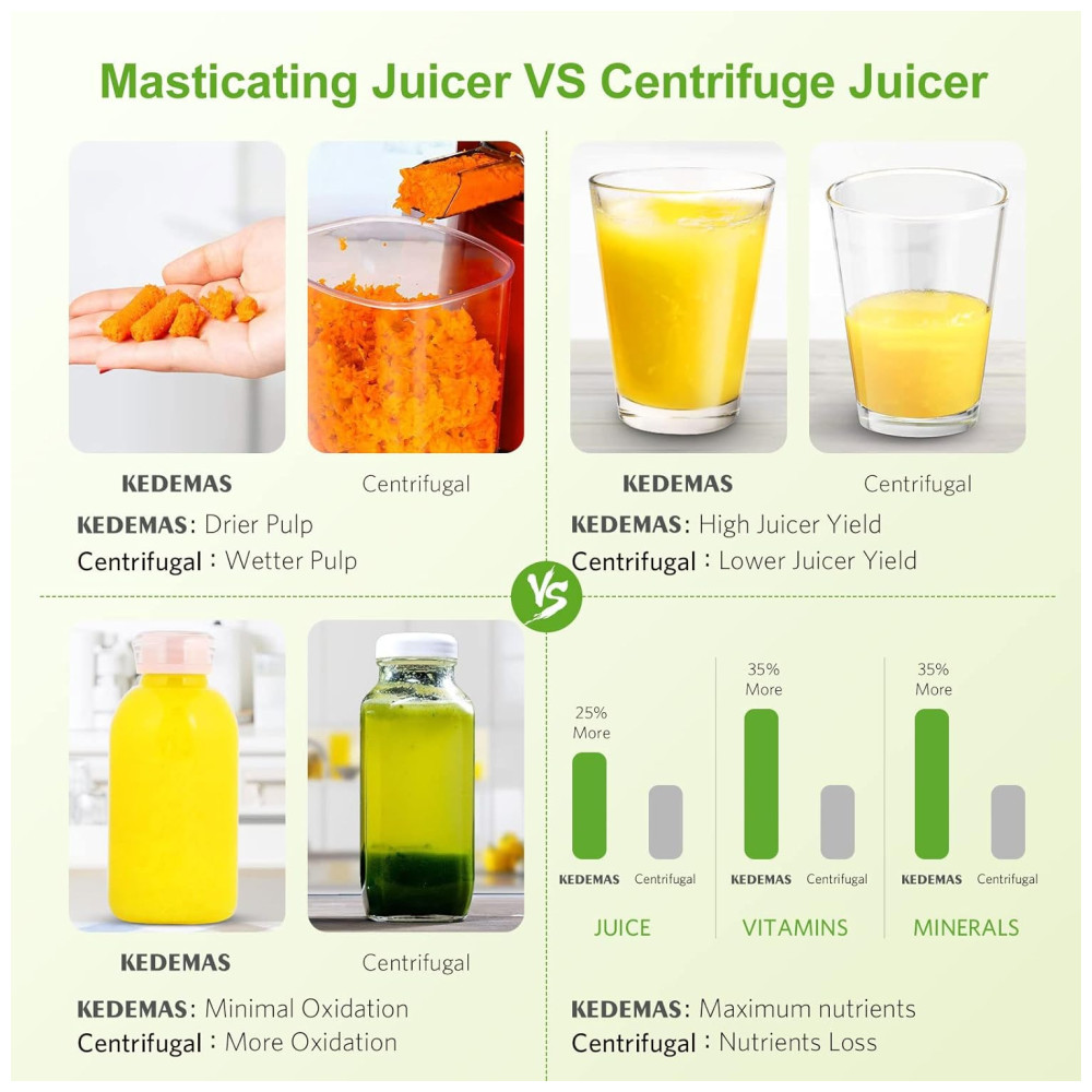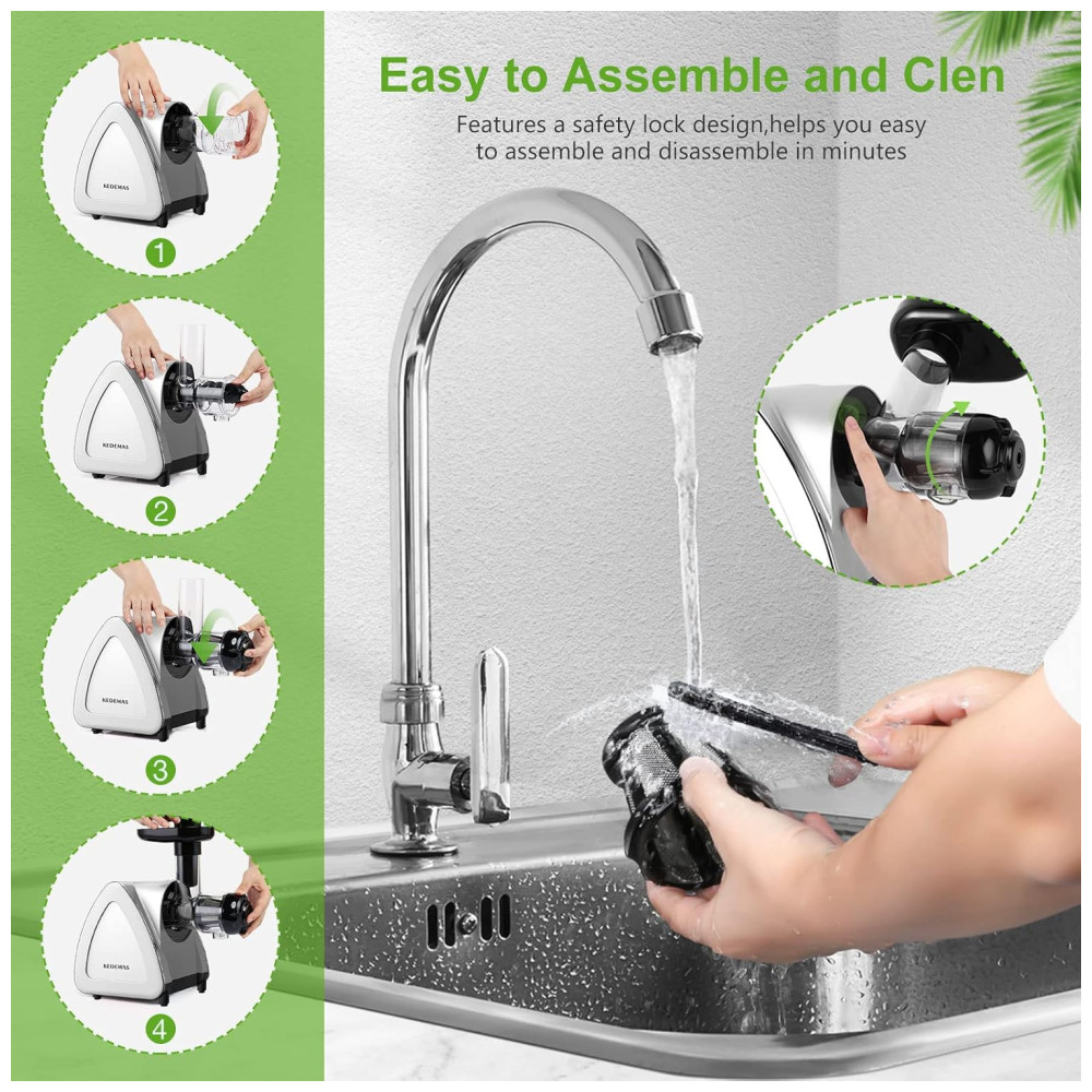 O extrator de sucos portátil KEDEMAS utiliza sistema de prensagem lenta a 80 rpm com espiral de 7 segmentos, permitindo extração eficiente de frutas, legumes e verduras, separando integralmente suco e polpa. Com potência de 150 W e funcionamento em 110V, opera silenciosamente (<60 dB), sendo indicado tanto para uso matinal quanto em ambientes que requerem baixo ruído.