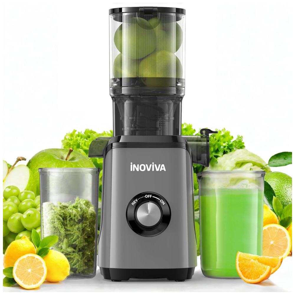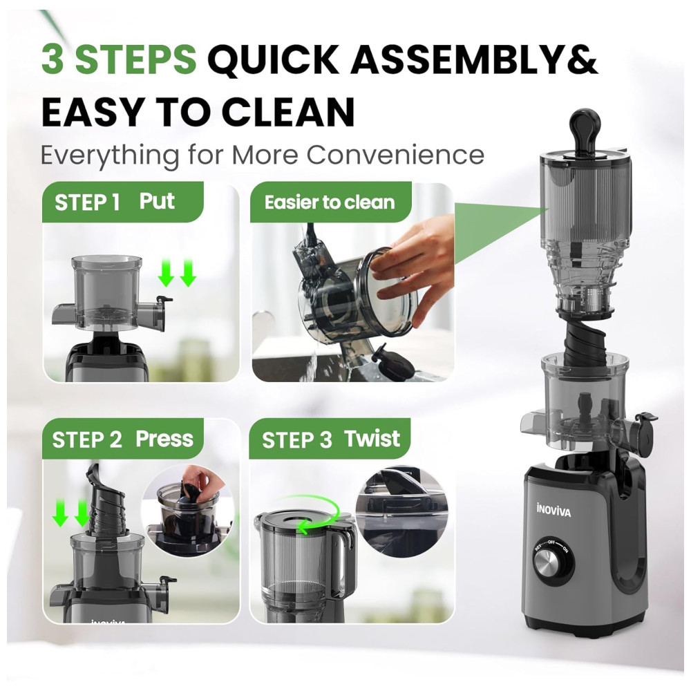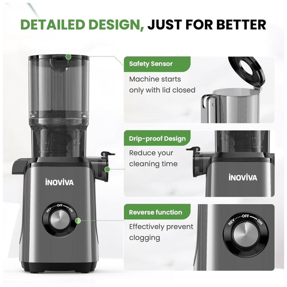O Extrator de Sucos INOVIVA é equipado com uma boca de alimentação extralarga de 11cm e um recipiente XL com capacidade de 1,5 litros, permitindo a inserção de frutas e vegetais inteiros como maçãs, tomates e pepinos sem a necessidade de pré-corte. Seu design vertical compacto economiza espaço no balcão, ocupando 30% a menos de espaço do que modelos tradicionais, ideal para cozinhas compactas mantendo capacidade de produção comercial. Com motor potente de 200W e tecnologia de prensagem lenta de 45RPM, alcança eficiência de 92% na extração de suco. Seu sistema avançado de espiral minimiza a oxidação, preservando 40% dos nutrientes em comparação com os centrifugadores. As peças centrais podem ser montadas/desmontadas em apenas 10 segundos, sendo todas as peças em contato com alimentos laváveis na lava-louças. A redução de 85% nos espaços entre as peças evita o acúmulo de polpa. Com operação simples de um botão giratório e função de reversão para evitar entupimentos, o extrator para automaticamente se a tampa for aberta acidentalmente durante o processo, garantindo segurança para as crianças.