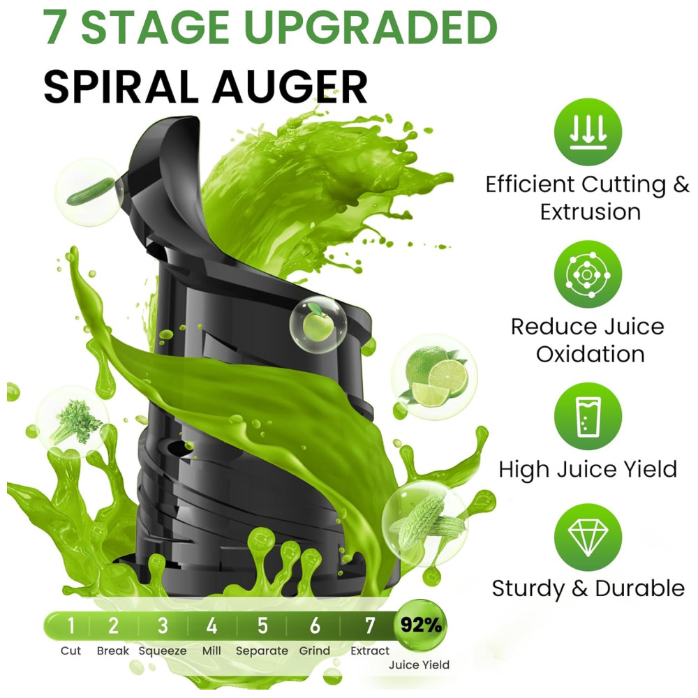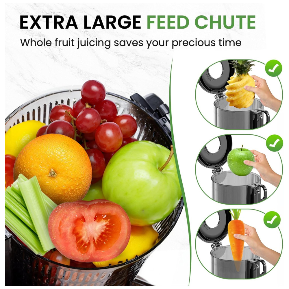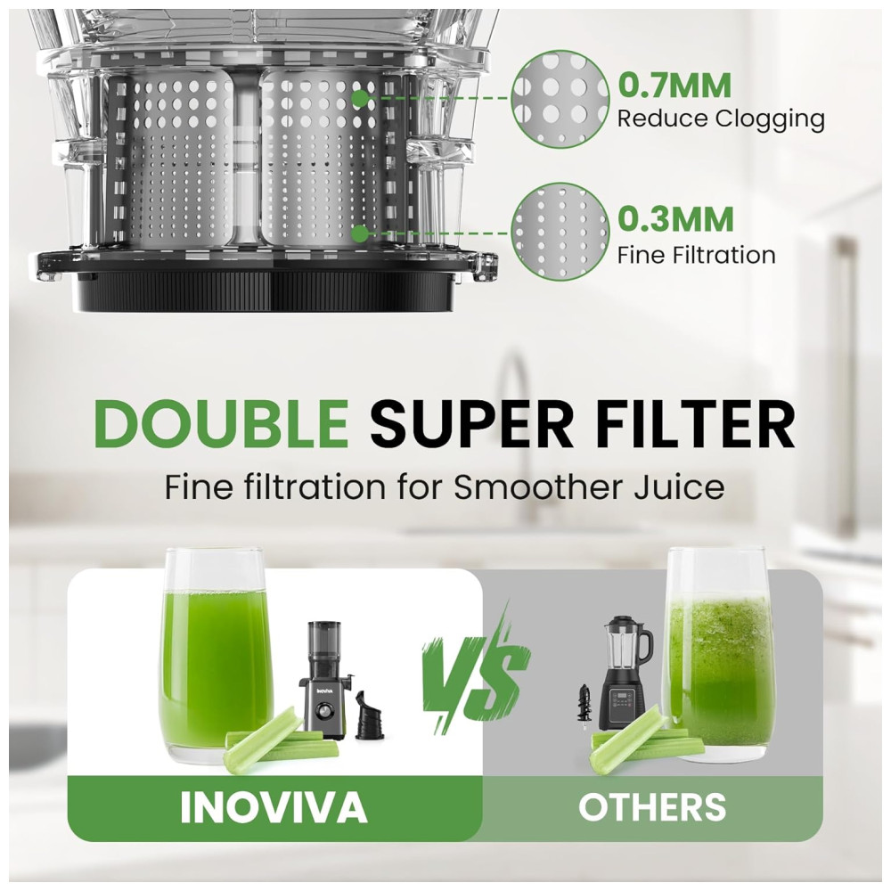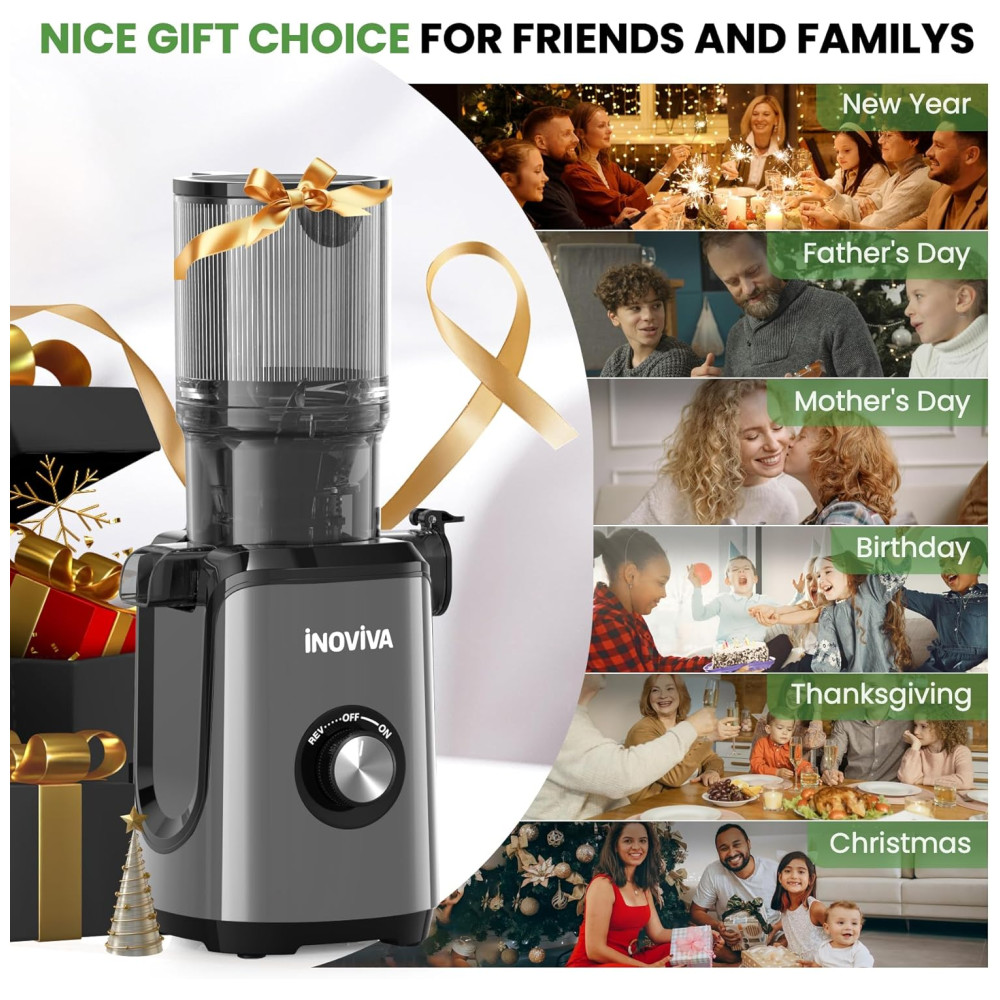 O Extrator de Sucos INOVIVA é equipado com uma boca de alimentação extralarga de 11cm e um recipiente XL com capacidade de 1,5 litros, permitindo a inserção de frutas e vegetais inteiros como maçãs, tomates e pepinos sem a necessidade de pré-corte. Seu design vertical compacto economiza espaço no balcão, ocupando 30% a menos de espaço do que modelos tradicionais, ideal para cozinhas compactas mantendo capacidade de produção comercial. Com motor potente de 200W e tecnologia de prensagem lenta de 45RPM, alcança eficiência de 92% na extração de suco. Seu sistema avançado de espiral minimiza a oxidação, preservando 40% dos nutrientes em comparação com os centrifugadores. As peças centrais podem ser montadas/desmontadas em apenas 10 segundos, sendo todas as peças em contato com alimentos laváveis na lava-louças. A redução de 85% nos espaços entre as peças evita o acúmulo de polpa. Com operação simples de um botão giratório e função de reversão para evitar entupimentos, o extrator para automaticamente se a tampa for aberta acidentalmente durante o processo, garantindo segurança para as crianças.