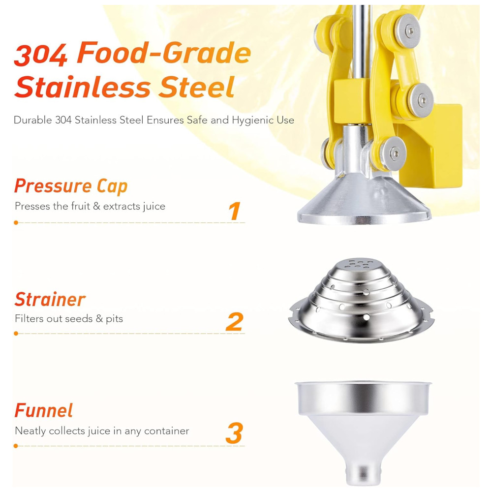 E DURABLE 6,8 kg de resistência reforçada ao ferro fundido proporcionam potência duradoura, suportando até 2300 psi de pressão para facilitar o uso, mas todas as partes deste espremedor de frutas manual robusto que toca sua bebida são de aço inoxidável 304 de qualidade alimentar para sua segurança e para uma limpeza fácil.
