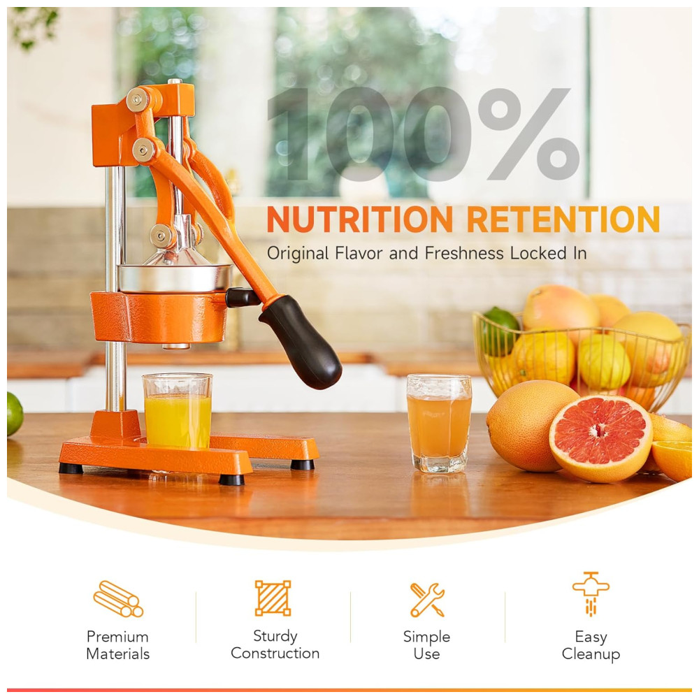 AMIGÁVEL PARA O USUÁRIO A pega de borracha da alça ergonômica longa mantém as coisas confortáveis, mesmo quando romãs de casca grossa e outras frutas favoritas são completamente esmagadas embaixo de você, enviando o suco passando pelo cone central para o copo de espera as sucções de base pesadas firmemente em sua bancada para lhe dar ainda mais força e facilidade.