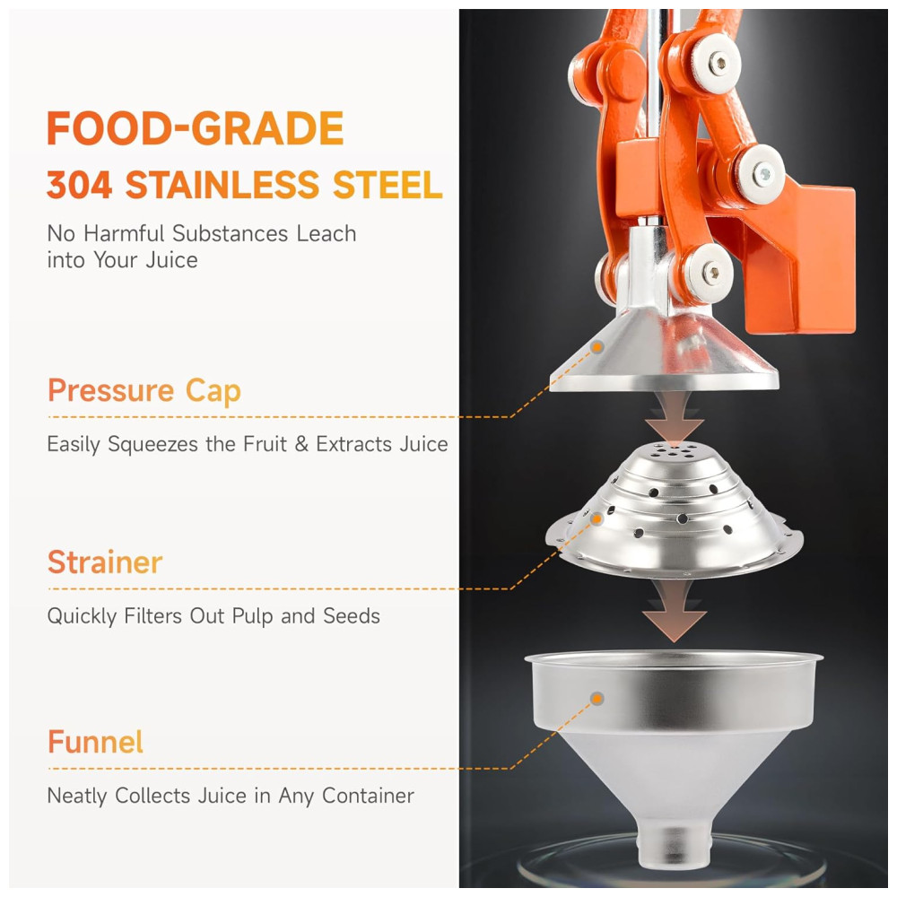 E DURÁVEL 6,8 kg de resistência de ferro fundido reforçado fornecem energia duradoura, suportando até 2300 psi de pressão para facilitar o uso, mas todas as partes deste robusto espremedor de frutas manual que toca sua bebida são de aço inoxidável 304 de qualidade alimentar para sua segurança e para uma limpeza fácil.