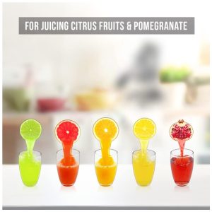 Rápido de espremer o espremedor de cítricos é rápido e simples de usar. Corte frutas cítricas ou romãs ao meio. Coloque o lado virado para baixo na tigela e puxe a alavanca. Beba o suco fresco e saudável.