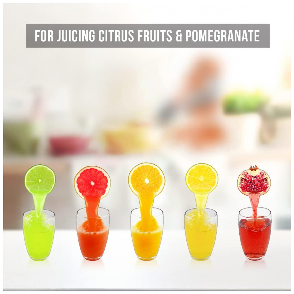 Rápido de espremer o espremedor de cítricos é rápido e simples de usar. Corte frutas cítricas ou romãs ao meio. Coloque o lado virado para baixo na tigela e puxe a alavanca. Beba suco fresco e saudável.