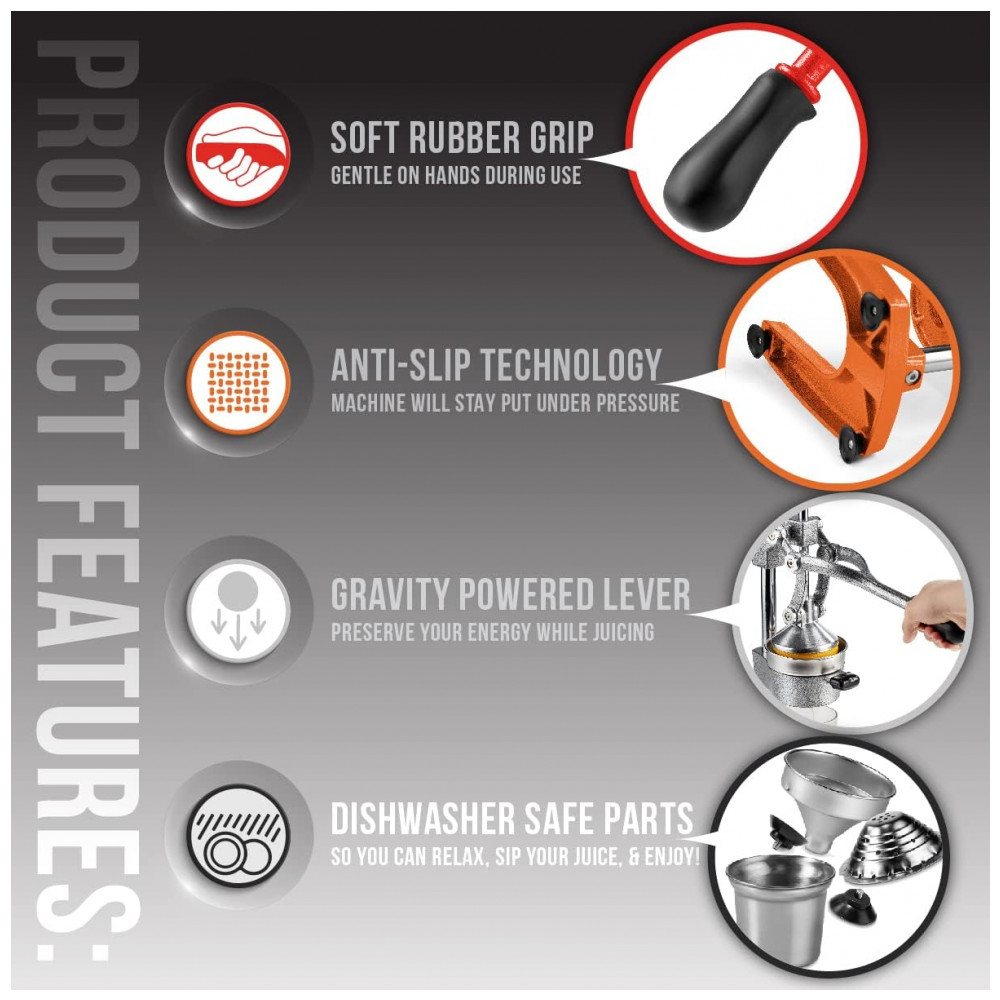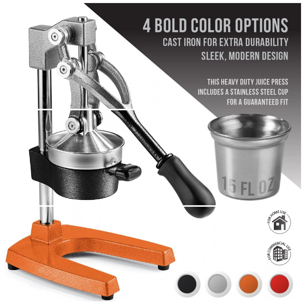 Qualidade profissional este espremedor manual é feito de ferro fundido resistente para sucos contínuos. A alavanca confiável ajuda você a espremer mais suco com menos esforço