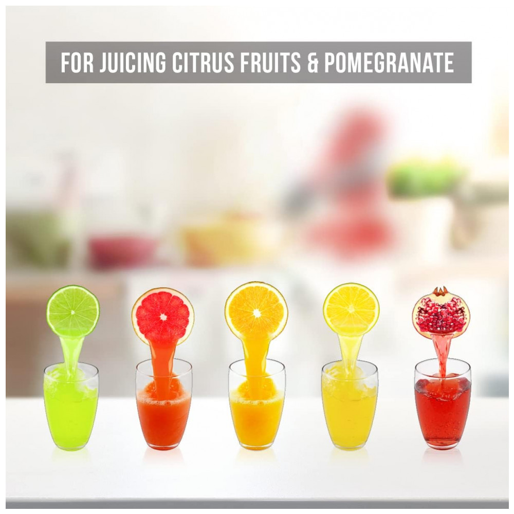 Rápido de espremer o espremedor de cítricos é rápido e simples de usar. Corte frutas cítricas ou romãs ao meio. Coloque o lado virado para baixo na tigela e puxe a alavanca. Beba suco fresco e saudável