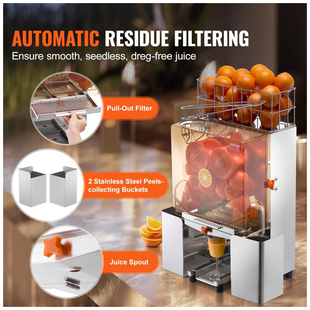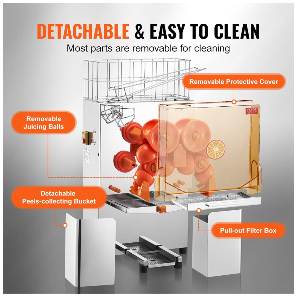 FÁCIL DE LIMPAR O elétrico do espremedor de suco de laranja adota uma caixa de filtro tipo pull out atualizada para uma limpeza mais conveniente. Dois baldes coletores de cascas e a bandeja de viagem são destacáveis. Uma limpeza rápida e simples para tornar seu trabalho muito mais fácil.