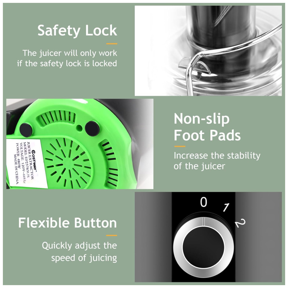 Fazendo um copo de suco por si mesmo Seja você um espremedor experiente ou queira descobrir todos os benefícios do suco, nosso espremedor de aço inoxidável de 400W é a ferramenta de cozinha que você precisa para tornar o suco rápido e fácil. O design de boca larga permite que você suco a maioria das frutas e legumes inteiros com facilidade. Este espremedor tem duas velocidades para ingredientes duros e macios. A bandeja de celulose extra grande permite um suco contínuo por muito mais tempo. É a melhor opção para desintoxicação do corpo, perda de peso, alternativa para dietas sem frutas e vegetais. Recurso Material de aço inoxidável para uso prolongado Motor de alta velocidade para economia de tempo e energia. Proteção contra superaquecimento e trava de segurança para manter sua confiabilidade. Especificação Material PP ABS Aço inoxidável Tensão nominal 120 V Potência nominal 400W Frequência nominal 60W Peso líquido 60Hz. Volume do jarro de suco 500ml. Design de boca larga de Nosso produto foi projetado com calha de alimentação de de largura para extrair frutas inteiras. Então você não precisa cortá lo em pedaços e apreciar o delicioso suco em poucos segundos. Funciona sem obstruções, sem mistura irregular, sem oxidação e preserva a maioria da nutrição. Modo de velocidade ajustável Com o modo de 2 velocidades, o extrator de suco pode atender a diferentes requisitos. A velocidade baixa 1 é adequada para melancia, laranjas e outras frutas e vegetais macios. A velocidade rápida 2 é perfeita para maçãs, cenouras e outras frutas e legumes duros. Proteção de segurança Nosso extrator de suco é projetado com funções de proteção confiáveis. Ele não começará a funcionar a menos que o aparelho e todas as peças tenham sido montadas corretamente. O sistema de proteção contra sobrecarga desligará o extrator de suco assim que a máquina estiver sobrecarregada. Bico de design especial pode manter a bebida fresca longe do pó. Tigela de filtro lavável em aço inoxidável, fácil de limpar e manter. O plugue de certificação UL pode garantir segurança e durabilidade extras. A almofada à prova de deslizamento para proteger esta máquina do suco derramado