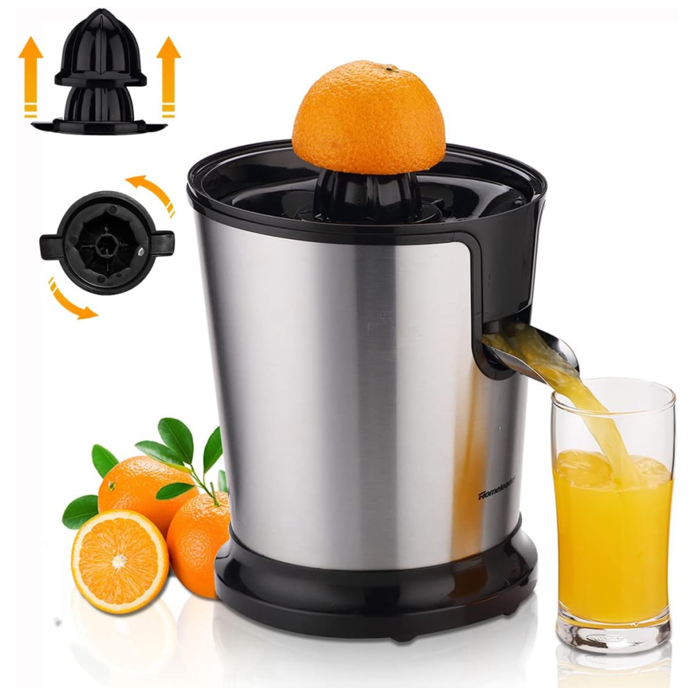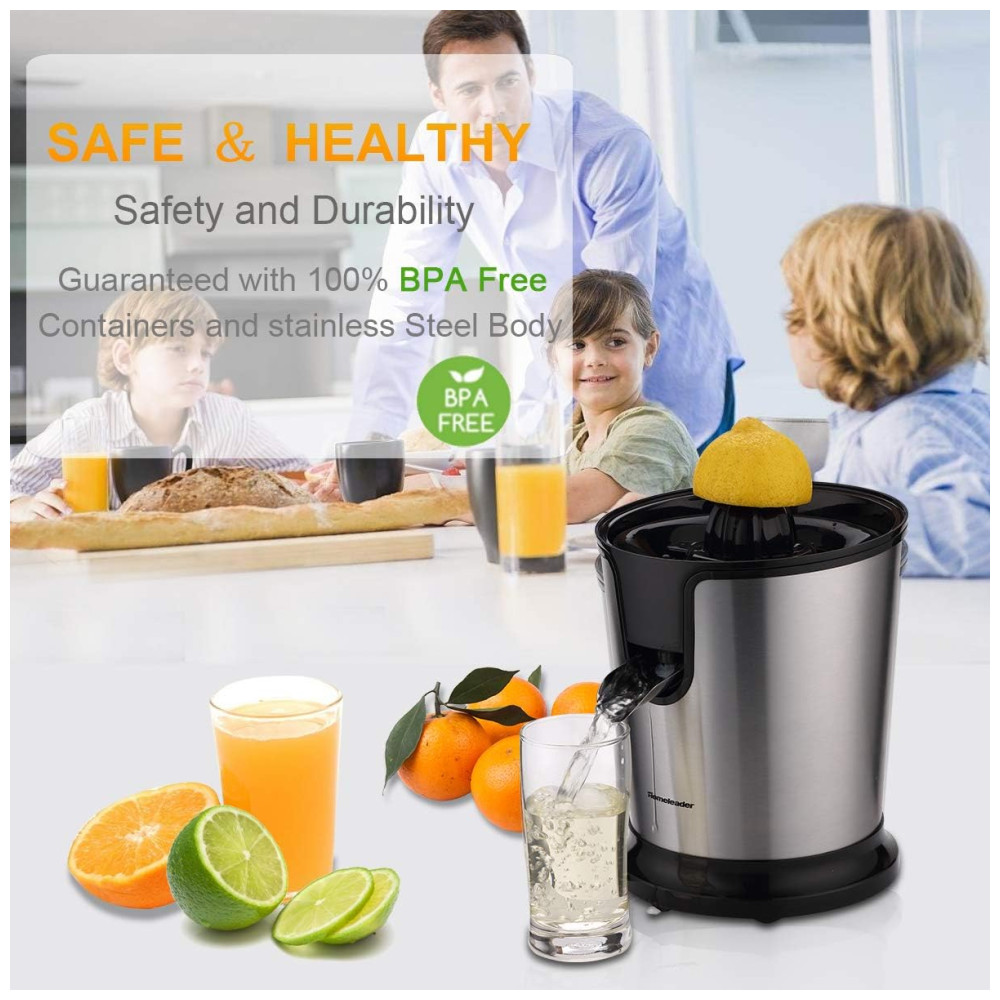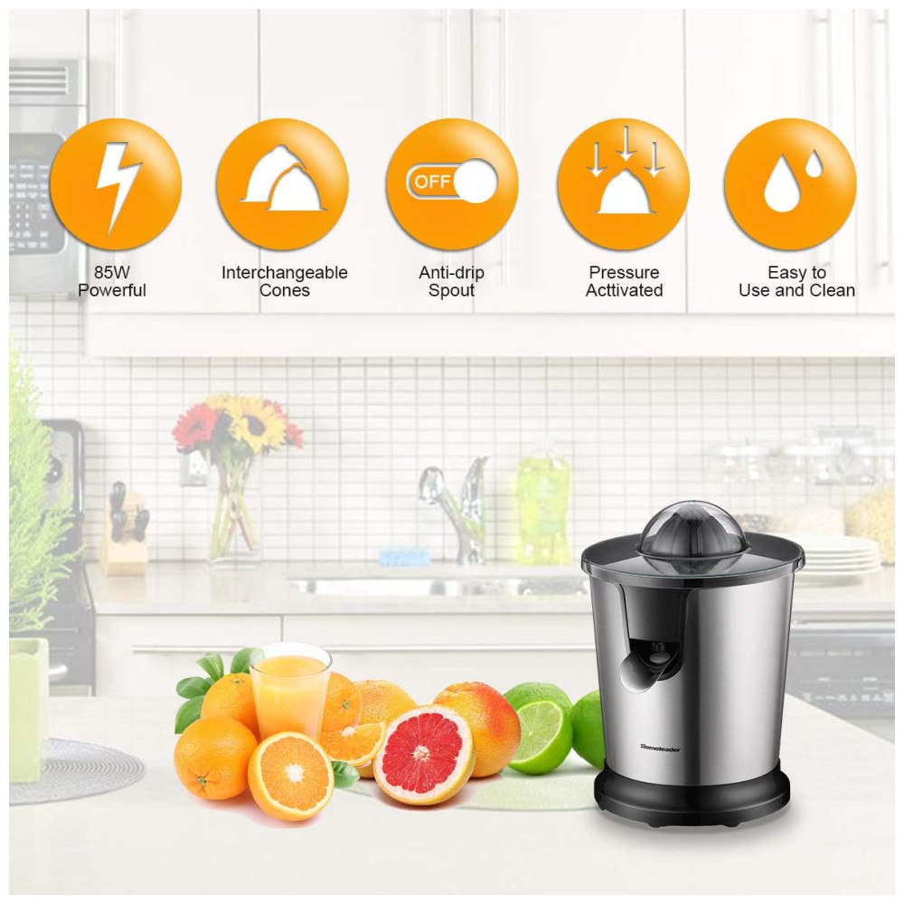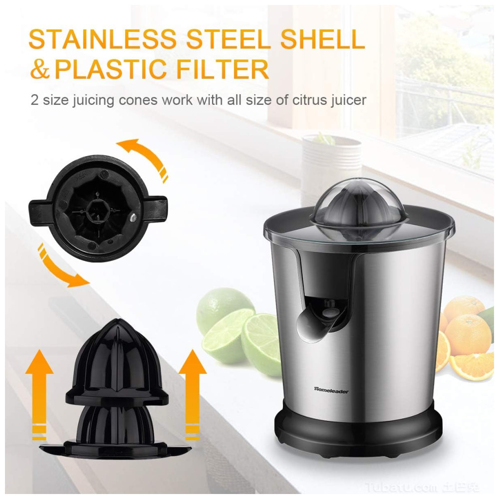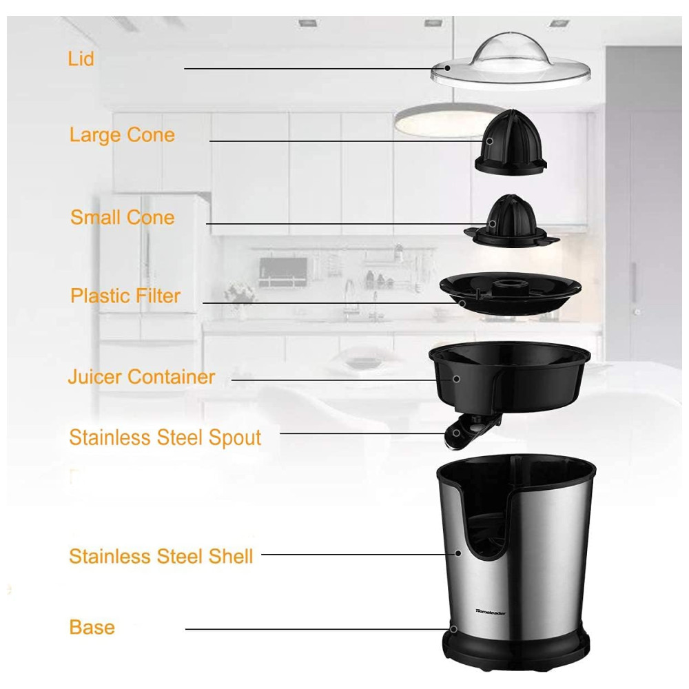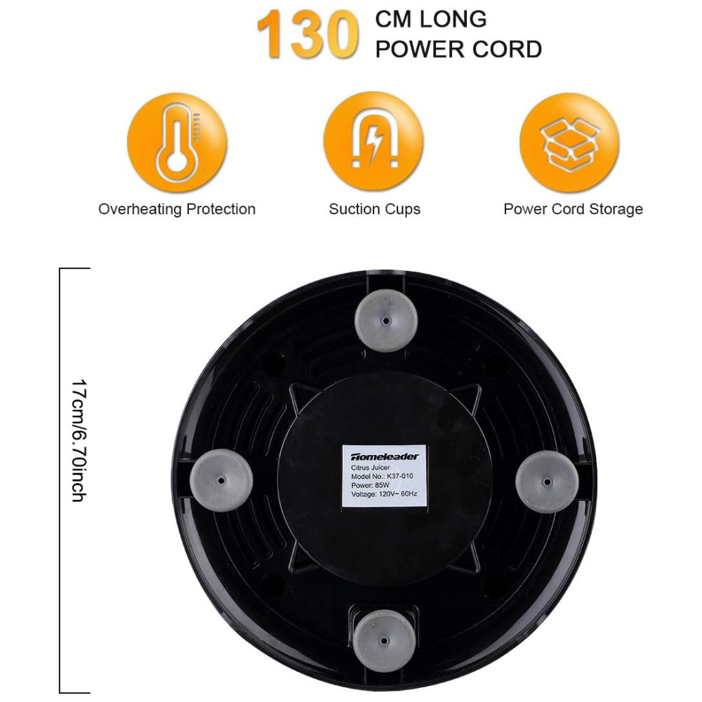 Com sistema de sensor de pressão e cones de tamanho duplo o espremedor de citrinos elétrico da Homeleader possui dois cones, o grande cone adequado para frutas maiores, como laranja e toranja, o menor é para limão e limões. Com um toque, você pode iniciar e parar. O cone rotativo foi projetado para extrair e extrair o máximo de suco possível.