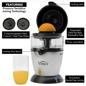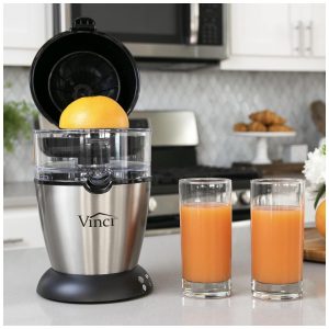 O espremedor de citrinos elétrico mãos livres Vinci é o espremedor de citrinos doméstico mais avançado do . Com o nosso mecanismo patenteado de Suco Automático, tudo o que você faz é fatiar a fruta ao meio, COLOCAR a fruta no alargador e pressionar o botão de suco. Não há necessidade de segurar ou espremer manualmente a fruta, o alargador de sumos eleva e extrai o suco mais fresco possível em apenas 10 segundos. Nossa tecnologia de sucos sensíveis à pressão detecta automaticamente a espessura da casca para garantir que você sempre obtenha o melhor suco sem sabores amargos que são frequentemente introduzidos quando a casca é raspada pelo alargador por outros espremedores. Conheça a Vinci Housewares A Vinci Housewares foi fundada no sul da Califórnia por uma equipe de engenheiros obcecados em aperfeiçoar as ferramentas que usamos na cozinha. A Vinci Housewares foi concebida com o desejo de fabricar produtos de ponta para uso doméstico, alavancando nossa filosofia central de ser altamente focada em qualidade, tecnologia e função. Todos os produtos Vinci aprimoram a funcionalidade e melhoram a usabilidade em relação a qualquer outro produto em suas respectivas categorias. Como o nome indica, a missão da Vinci é vencer e sobrecarregar nossos clientes, superando as expectativas. O espremedor de citrinos elétrico mãos livres Vinci possui todos os recursos que você deseja MAIS EFICIENTE O Vinci Juicer detecta automaticamente a espessura da casca, oferecendo a quantidade ideal de suco cítrico fresco. RÁPIDO Suco de laranja completo em apenas alguns segundos VERSÁTIL Suco de citrinos de todos os tamanhos, de limão a toranja FÁCIL DE LIMPAR Todas as peças laváveis são removíveis e não podem ser lavadas na máquina de lavar louça. Motor de serviço pesado construído para suportar anos de uso GRANDE CAPACIDADE 350ML. Reservatório de Suco MELHOR PROVA Tecnologia de Suco Sensível à Pressão Detecta automaticamente a espessura da casca de citros, sem quebrá la o que pode tornar o suco mais amargo Quantidade de suco cítrico fresco O espremedor de mãos livres Vinci é tão fácil de usar