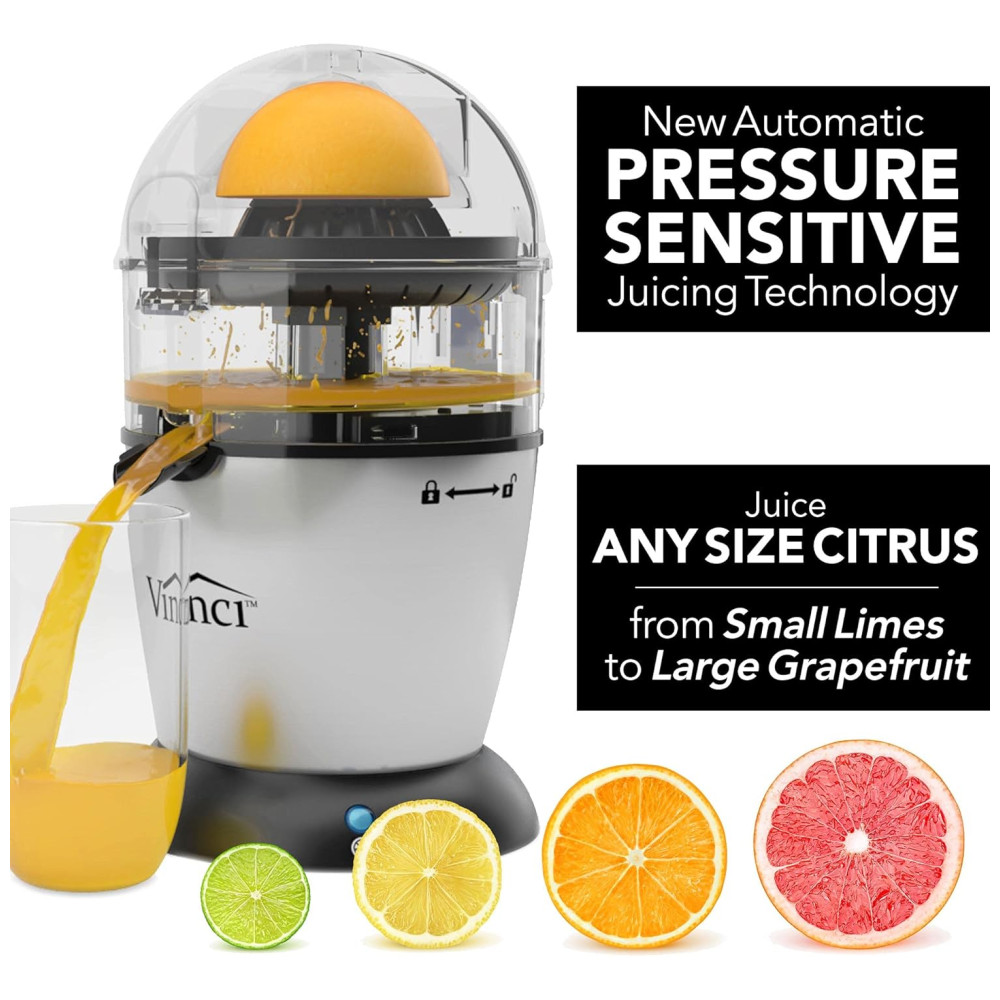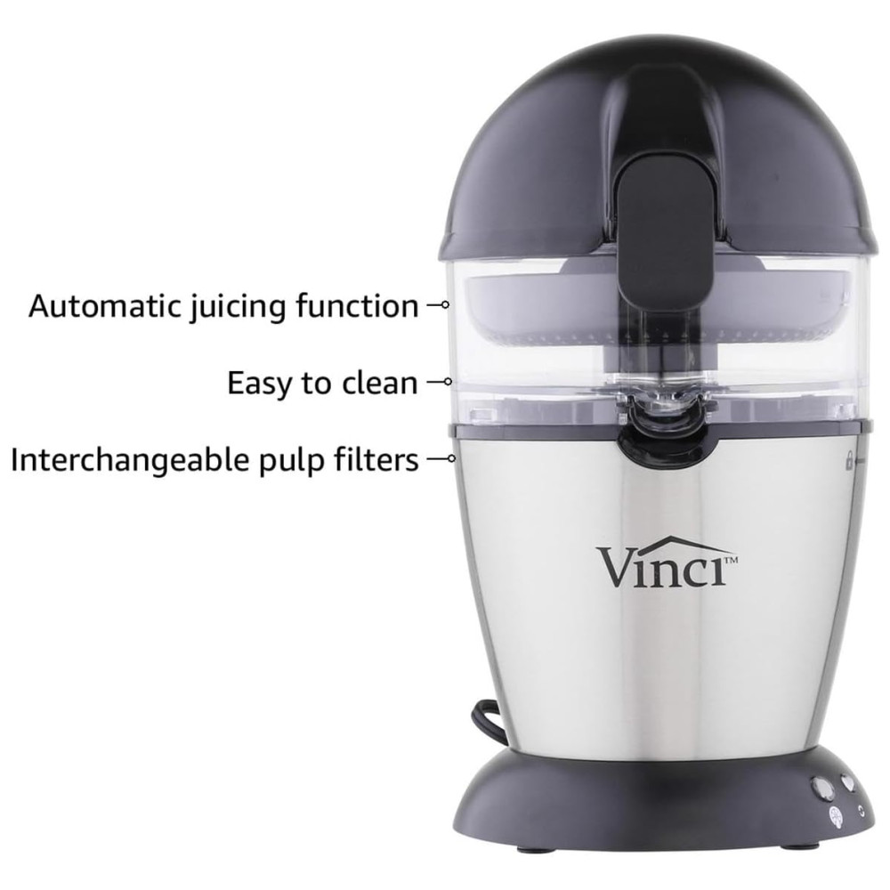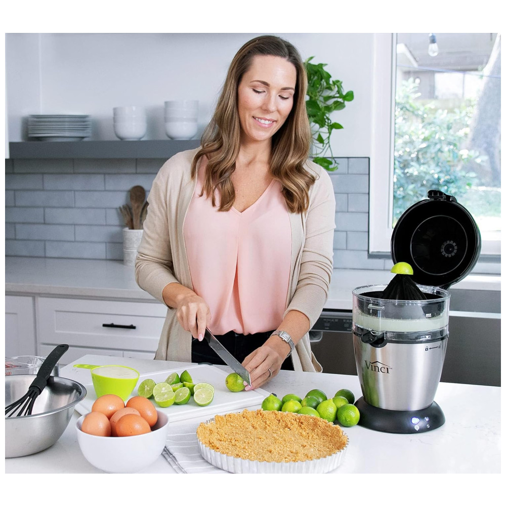 O espremedor de citrinos elétrico mãos livres Vinci é o espremedor de citrinos doméstico mais avançado do . Com o nosso mecanismo patenteado de Suco Automático, tudo o que você faz é fatiar a fruta ao meio, COLOCAR a fruta no alargador e pressionar o botão de suco. Não há necessidade de segurar ou espremer manualmente a fruta, o alargador de sumos eleva e extrai o suco mais fresco possível em apenas 10 segundos. Nossa tecnologia de sucos sensíveis à pressão detecta automaticamente a espessura da casca para garantir que você sempre obtenha o melhor suco sem sabores amargos que são frequentemente introduzidos quando a casca é raspada pelo alargador por outros espremedores. Conheça a Vinci Housewares A Vinci Housewares foi fundada no sul da Califórnia por uma equipe de engenheiros obcecados em aperfeiçoar as ferramentas que usamos na cozinha. A Vinci Housewares foi concebida com o desejo de fabricar produtos de ponta para uso doméstico, alavancando nossa filosofia central de ser altamente focada em qualidade, tecnologia e função. Todos os produtos Vinci aprimoram a funcionalidade e melhoram a usabilidade em relação a qualquer outro produto em suas respectivas categorias. Como o nome indica, a missão da Vinci é vencer e sobrecarregar nossos clientes, superando as expectativas. O espremedor de citrinos elétrico mãos livres Vinci possui todos os recursos que você deseja MAIS EFICIENTE O Vinci Juicer detecta automaticamente a espessura da casca, oferecendo a quantidade ideal de suco cítrico fresco. RÁPIDO Suco de laranja completo em apenas alguns segundos VERSÁTIL Suco de citrinos de todos os tamanhos, de limão a toranja FÁCIL DE LIMPAR Todas as peças laváveis são removíveis e não podem ser lavadas na máquina de lavar louça. Motor de serviço pesado construído para suportar anos de uso GRANDE CAPACIDADE 350ML. Reservatório de Suco MELHOR PROVA Tecnologia de Suco Sensível à Pressão Detecta automaticamente a espessura da casca de citros, sem quebrá la o que pode tornar o suco mais amargo Quantidade de suco cítrico fresco O espremedor de mãos livres Vinci é tão fácil de usar