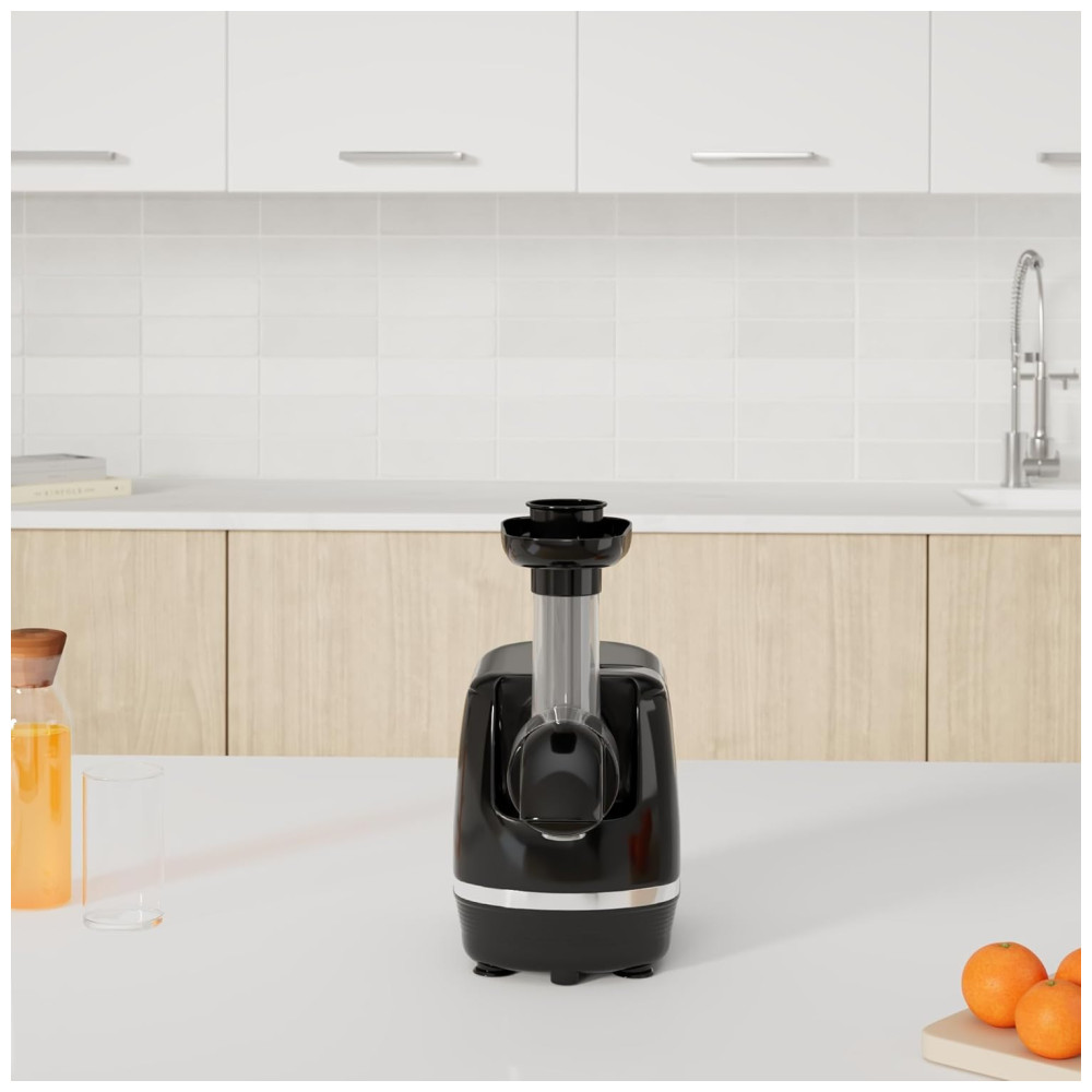 A estrutura conta com componentes plásticos livres de BPA, lâminas internas de aço inoxidável e operação prática com apenas um nível de velocidade. A desmontagem para limpeza é simples e grande parte das peças são compatíveis com lava-louças (exceto tambor). Inclui recipientes dedicados para suco e polpa, escova para limpeza fina e dois tipos de peneiras (grossa/fina), garantindo versatilidade no preparo.