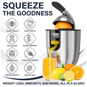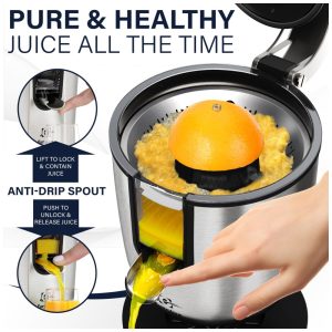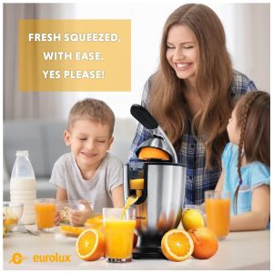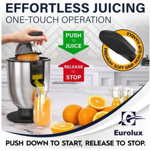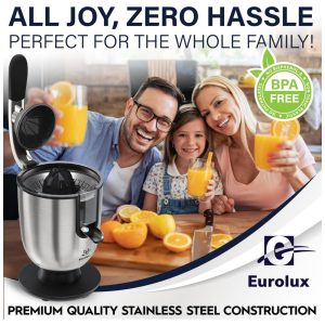 O espremedor elétrico Eurolux Premium foi projetado para extração eficiente de sucos cítricos, como laranja, limão e grapefruit, combinando praticidade com acabamento em aço inox escovado de alta durabilidade. Equipado com motor potente de 160 W, oferece operação silenciosa e rápida, com mecanismo automático de reversão e proteção contra superaquecimento.