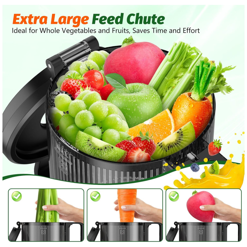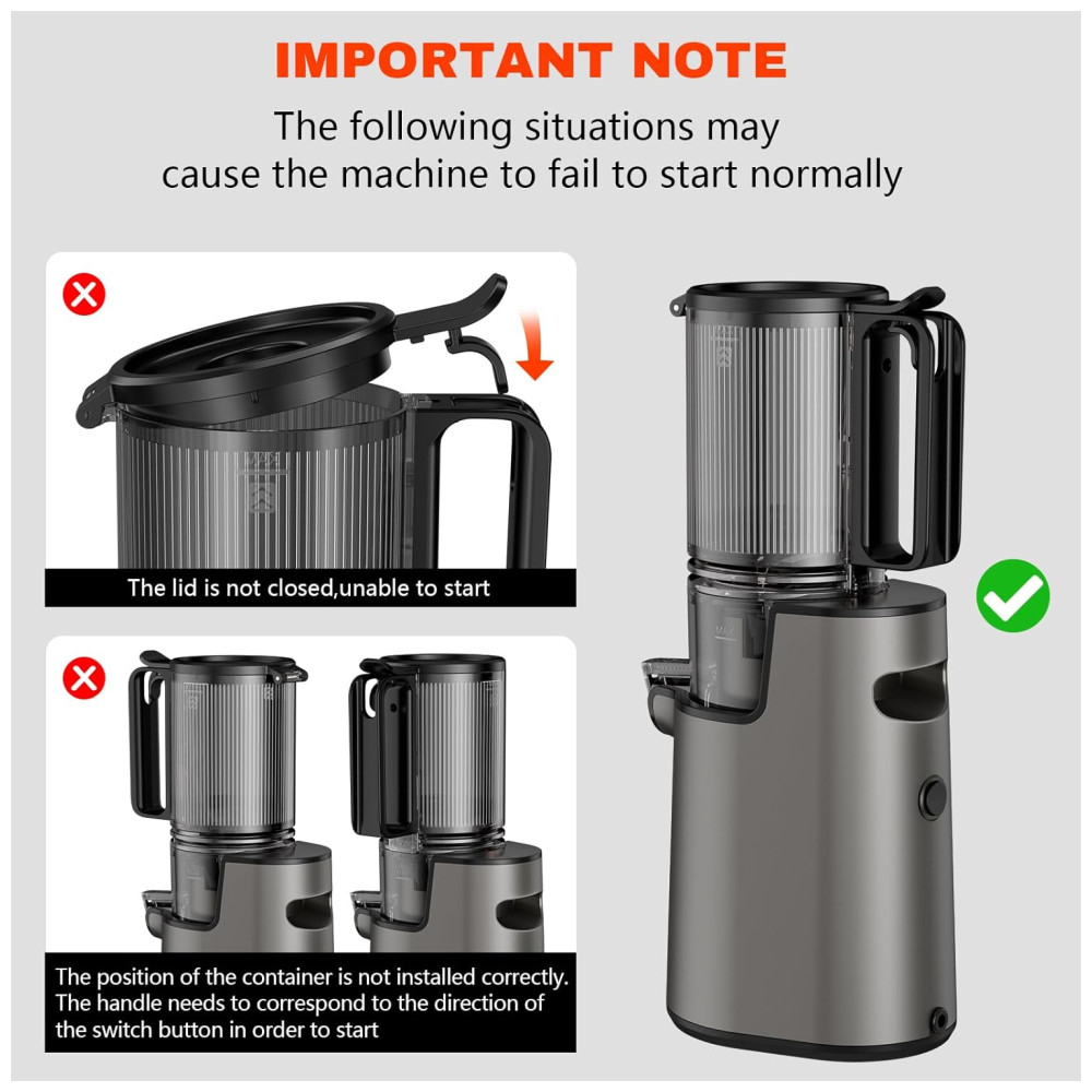 Fácil e Seguro de Operar: Nosso espremedor conta com um funil largo e design sem lâminas, que desliga automaticamente a máquina quando a tampa é aberta. Isso melhora a eficiência do processo de extração e garante a segurança durante o uso.