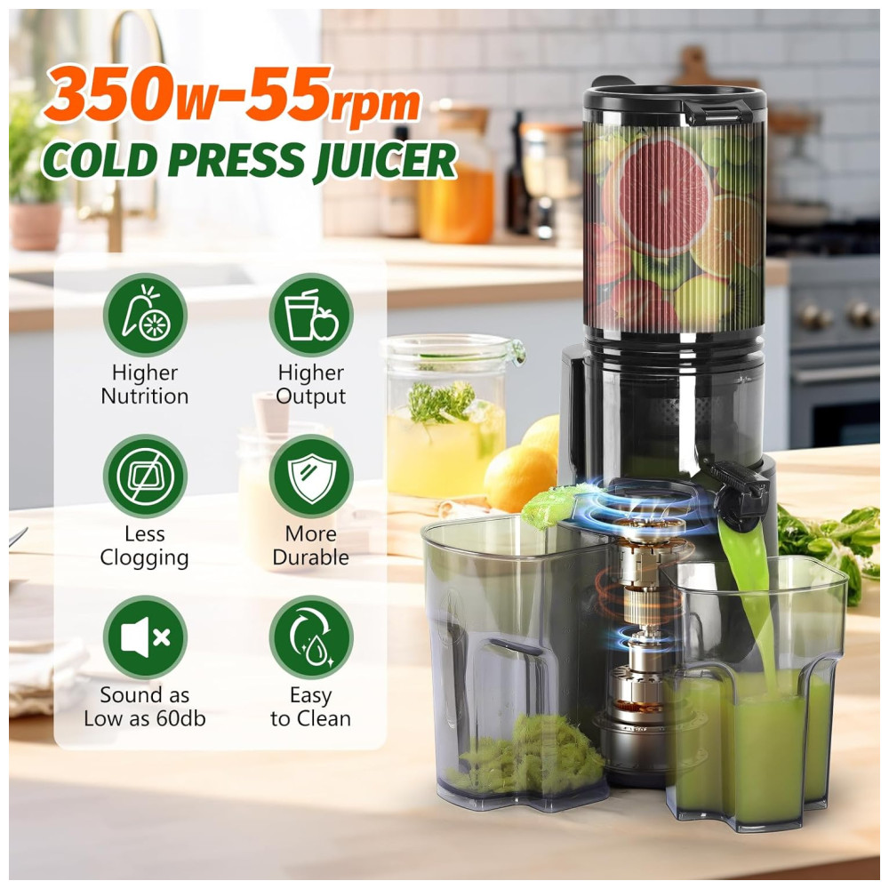 Design Eficiente e Completo: Com 350 watts de potência, nosso espremedor conta com um conjunto de parafuso de padrão de segurança alimentar, que facilita o processamento de diversos tipos de frutas e vegetais. Equipado com um filtro de precisão de dupla camada, ele separa efetivamente as fibras da polpa, proporcionando um suco mais suave e delicado. A eficiência de extração pode chegar a até 99%.