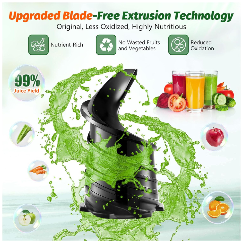 Experiência de Limpeza Conveniente: Nosso espremedor de pressão fria all-in-one possui uma estrutura simples, composta por apenas três partes principais, e vem com uma ferramenta de limpeza especial, tornando a montagem, desmontagem e limpeza rápidas e fáceis.