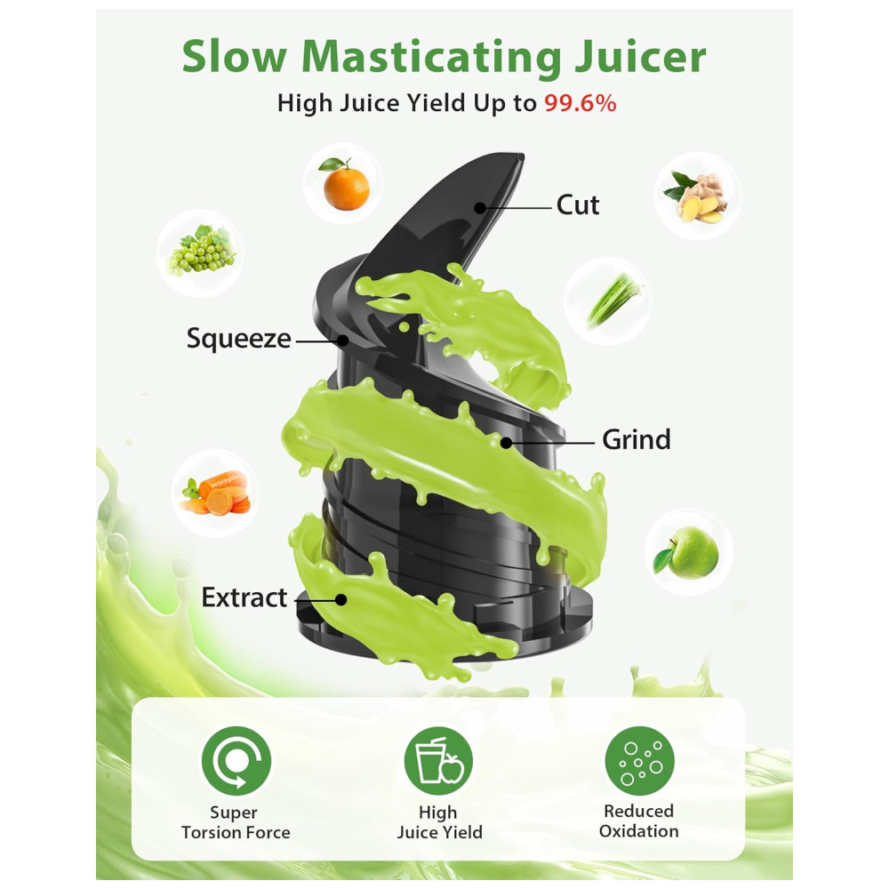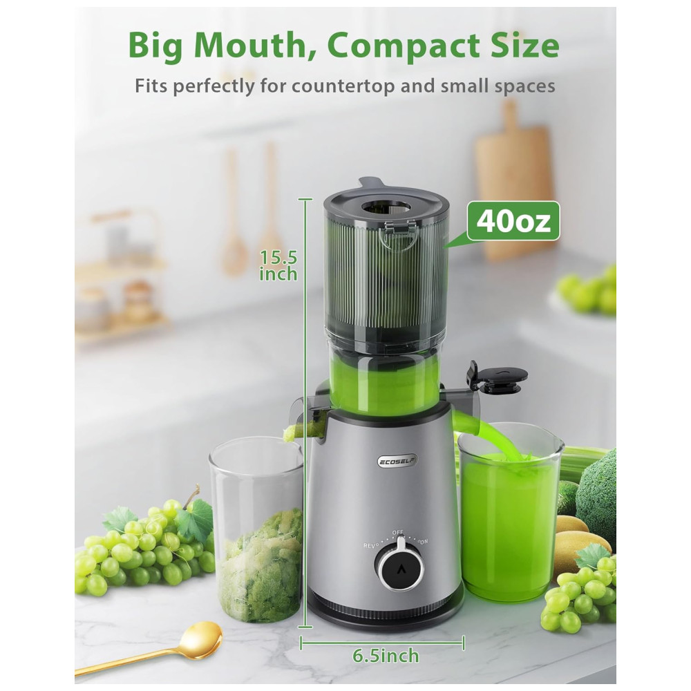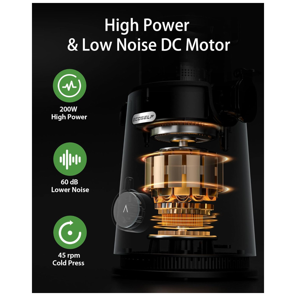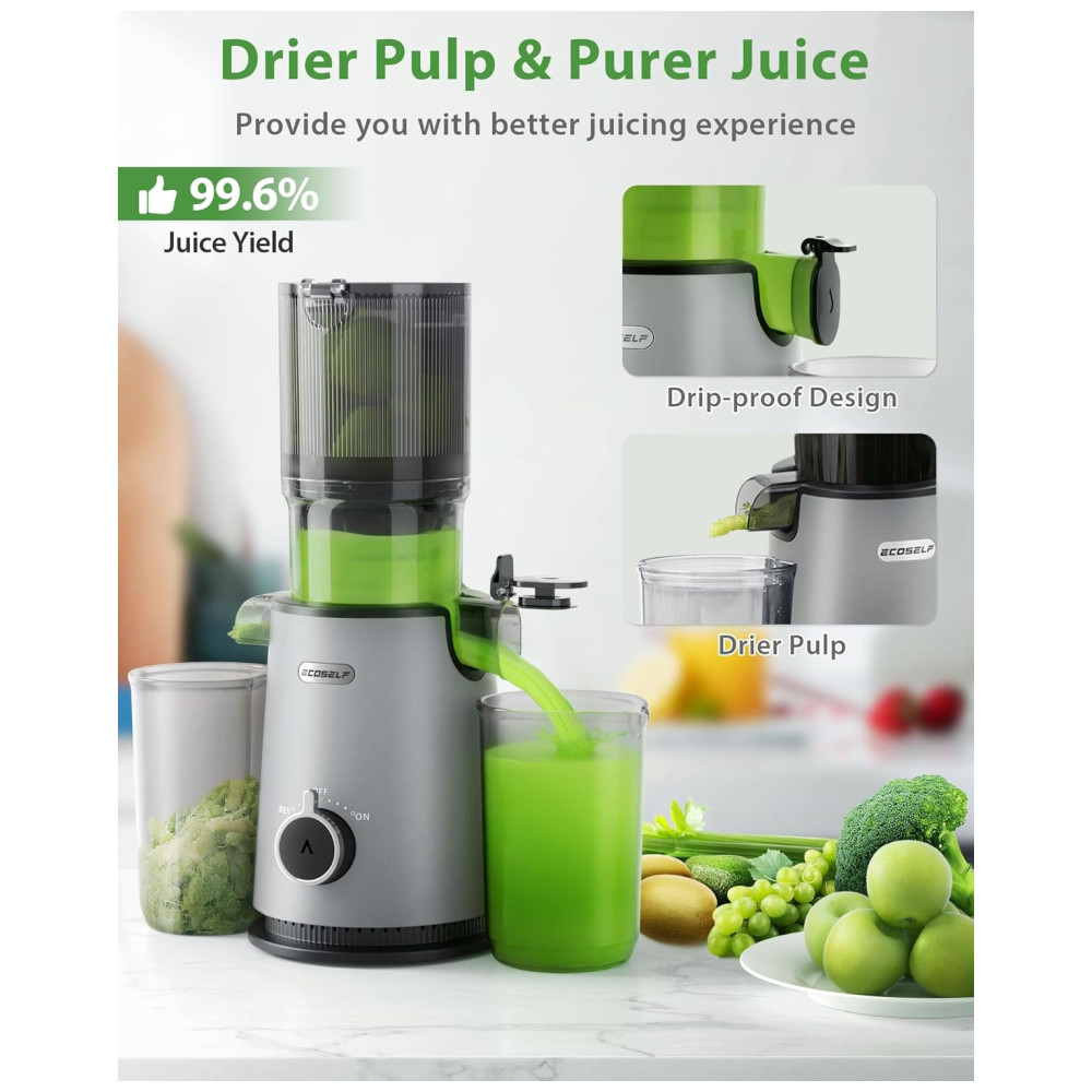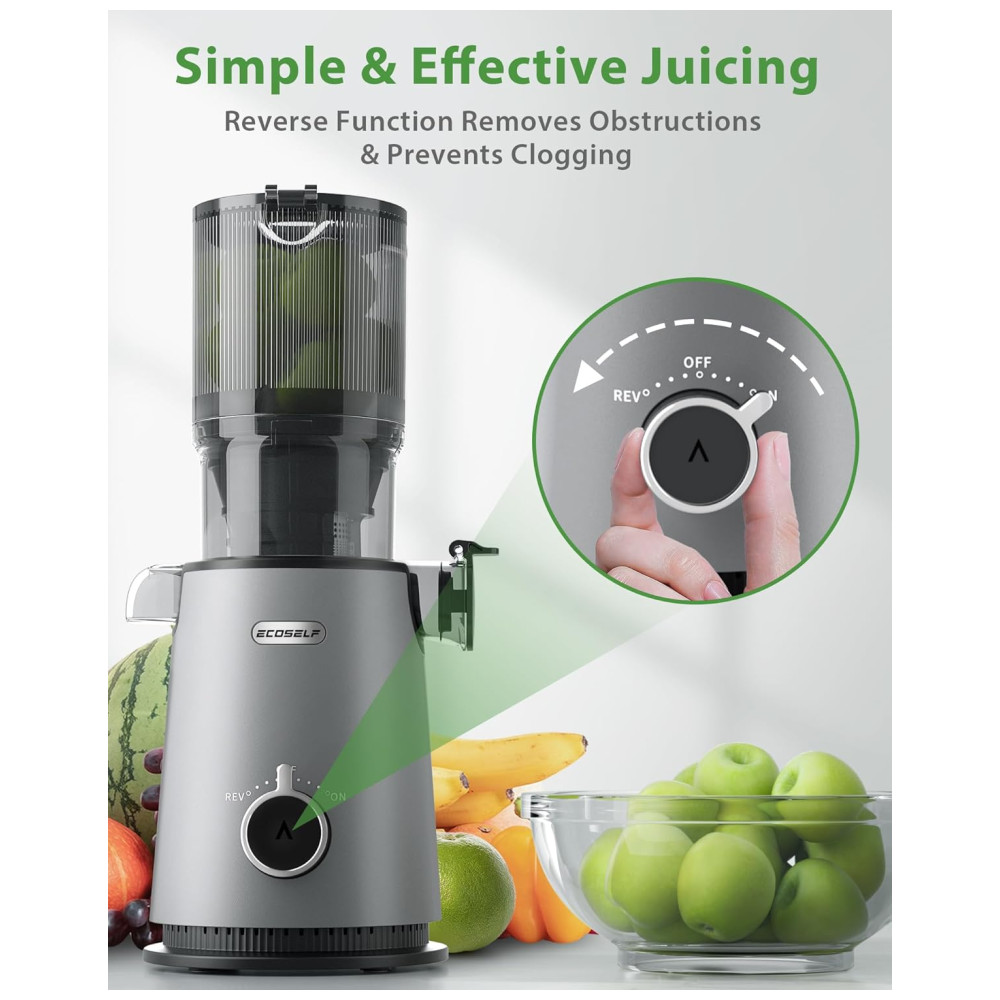 Espremedor de Sucos de Pressão Fria ECOSELF Lento com Funil Grande de 11 cm Ideal para Frutas e Vegetais Inteiros Alimentação Automática.