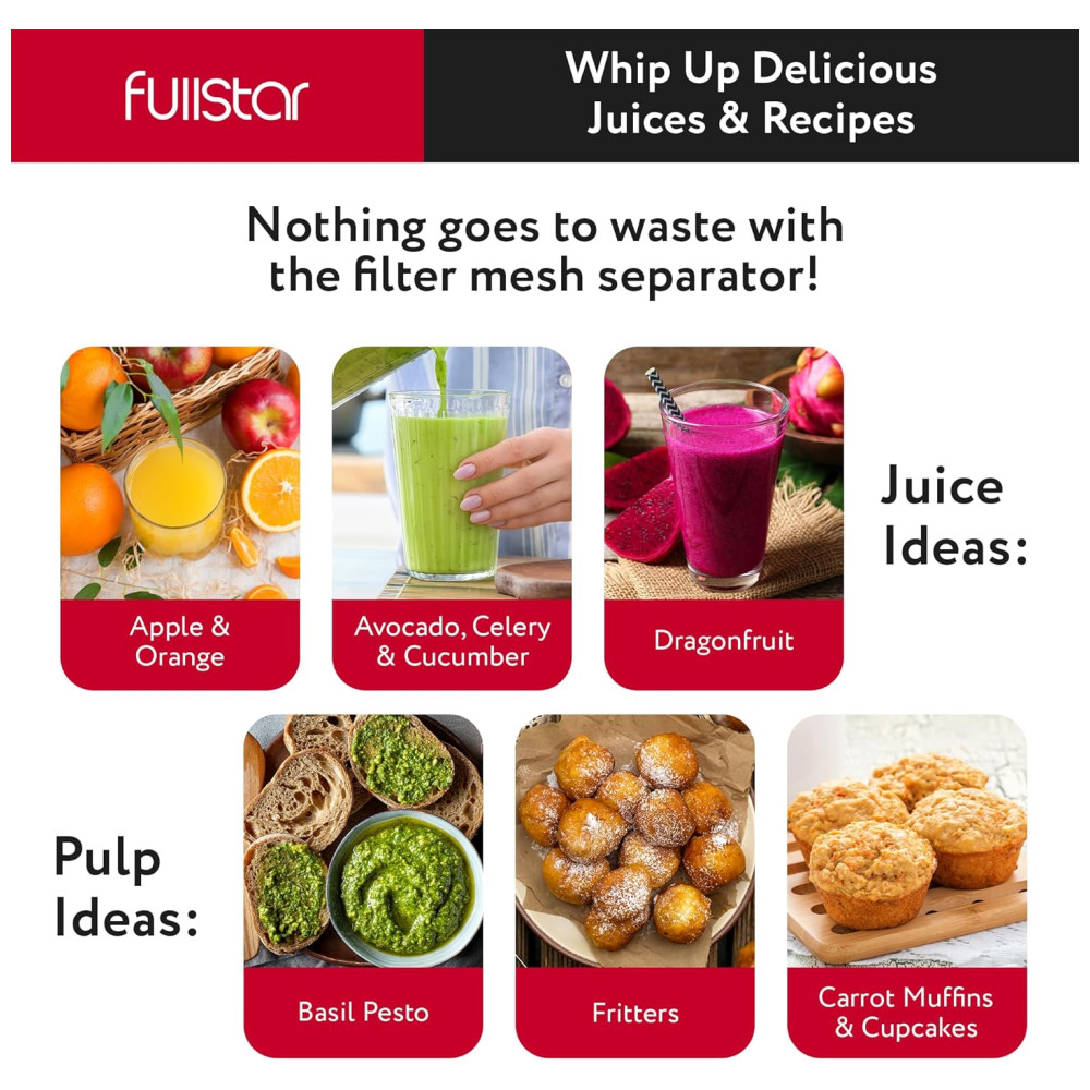 Suco Fresco em Segundos – O Espremedor de Sucos Fullstar 400W é compacto, mas poderoso, com uma chute de alimentação larga de 7,6 cm que permite que você extraia sucos de pedaços maiores sem cortar. Ele ocupa menos espaço na cozinha, extrai sucos nutritivos de forma eficiente, e a base estável garante uma operação suave.