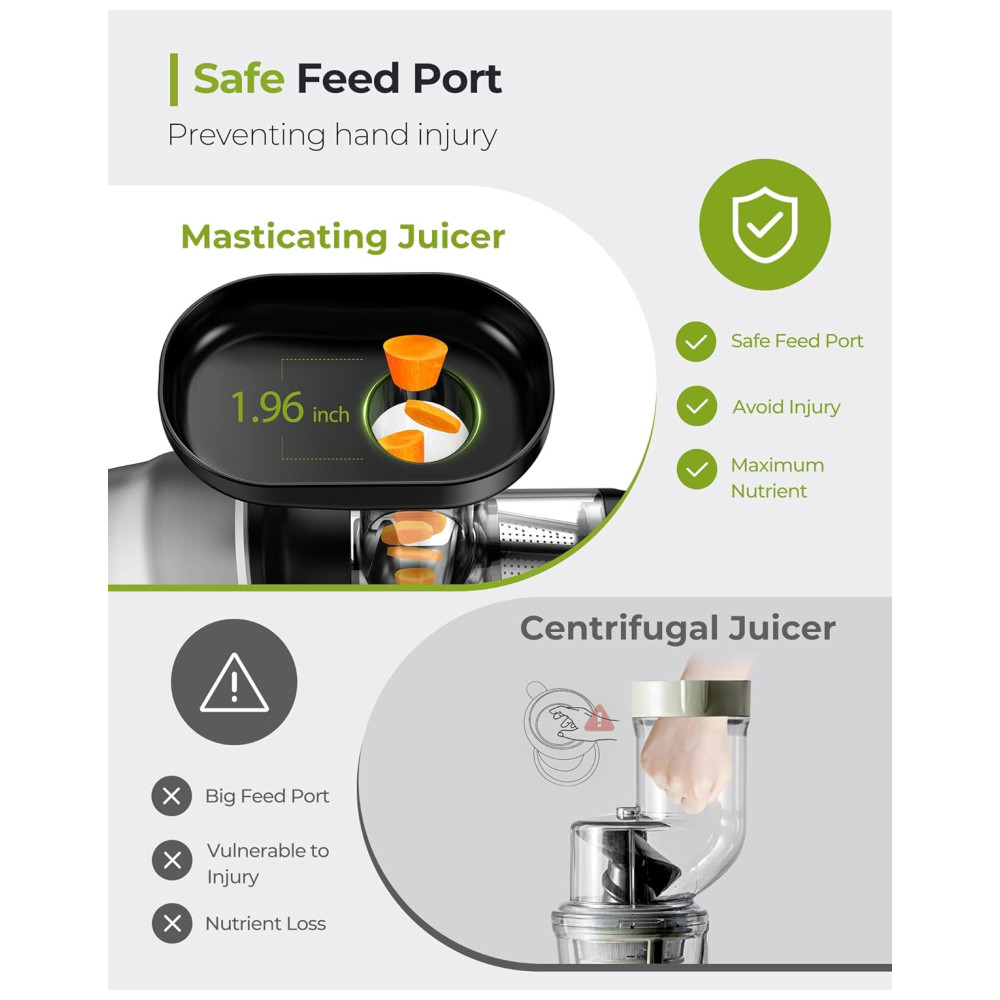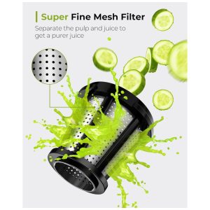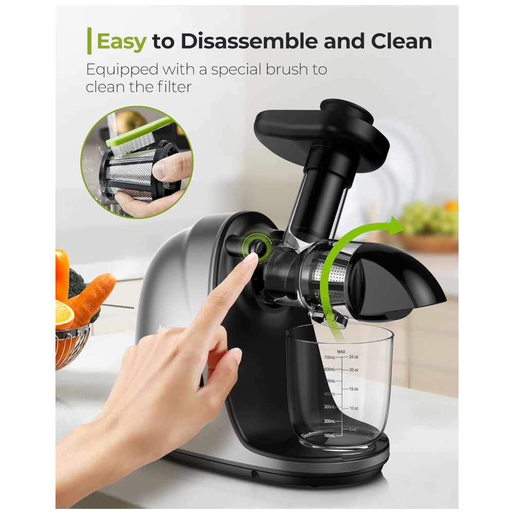 Regulação de duas velocidades e função reversa. Regulação de duas velocidades para diferentes frutas e legumes. Pressione e segure a função reversa para liberar o bloqueio. Desmontagem de um botão. Pressione o botão preto na lateral do corpo de sucos e gire o corpo de sucos no sentido horário ao mesmo tempo para tirar fora do corpo de sucos. Foco de limpeza. Vem com uma escova de limpeza na embalagem. Louça de peça destacável segura