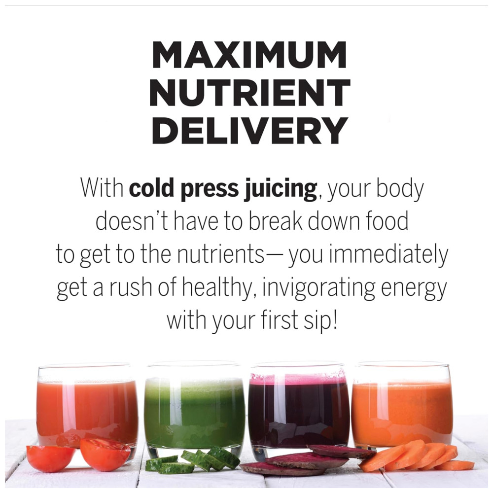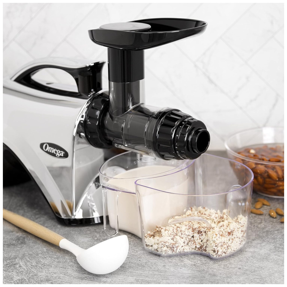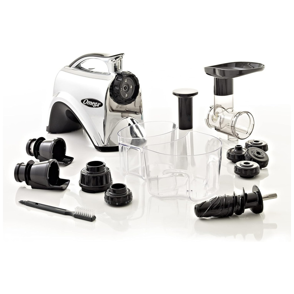 Os Centros de Nutrição da Omega são extratos de suco estilo mastigatório e muito mais. Um espremedor de sucos mastigável em baixas velocidades de 80 RPM, minimizando o aumento de calor e a oxidação. O sistema do trado força a produção em uma câmara apertada, triturando e pressionando o alimento para extrair o suco de itens tão finos como grama de trigo e vegetais folhosos. Com um Centro de Nutrição você também pode fazer manteigas de nozes totalmente naturais, comida para bebês, leite de soja, leite de amêndoa e uma variedade de lanches saudáveis. Inclui 6 bicos e 2 telas de suco