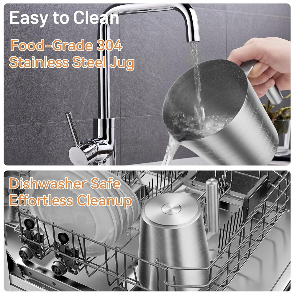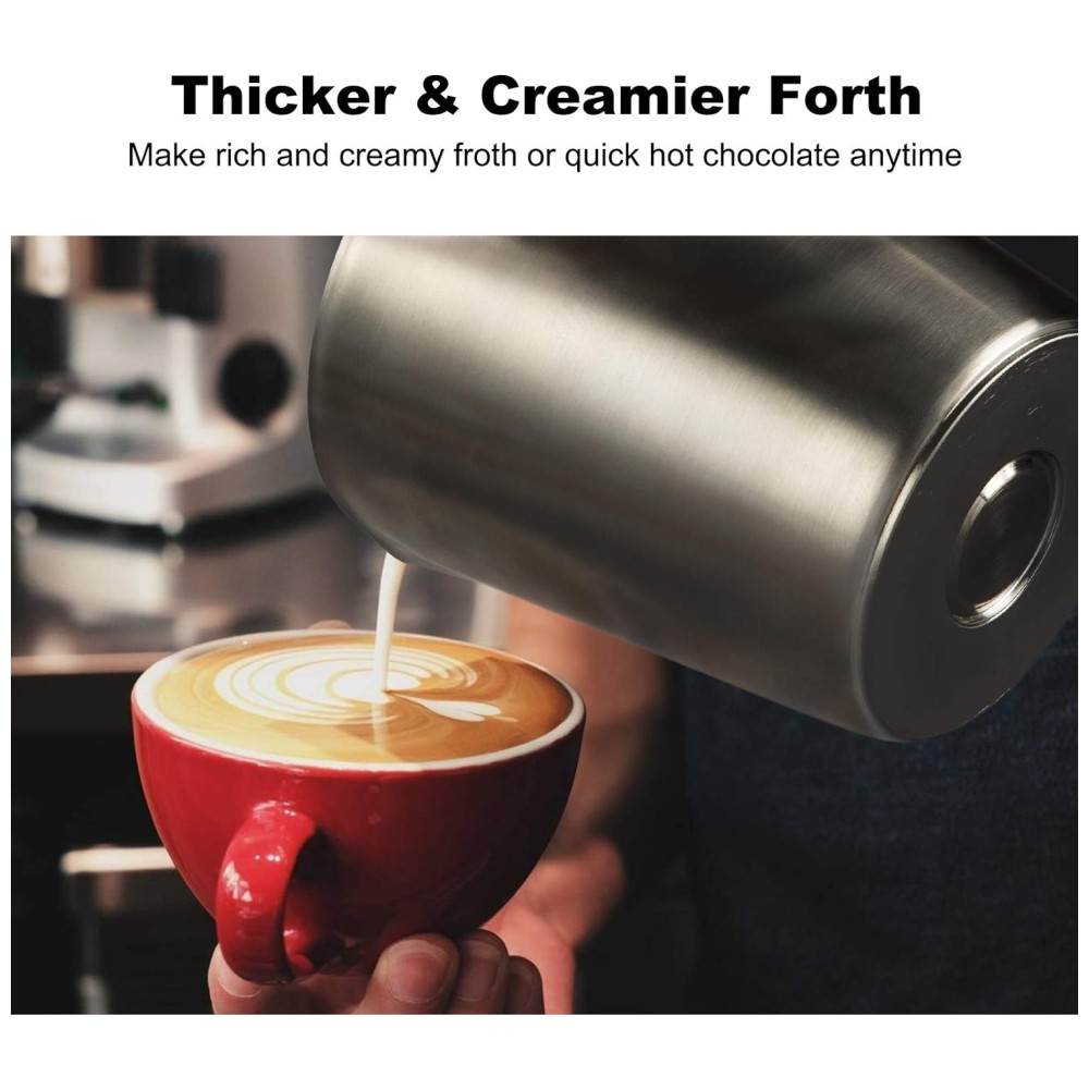 O Batedor de Leite e Fabricante de Chocolate Quente é perfeito para criar uma espuma densa e rica para café, lattes, cappuccinos e chocolate quente. Com capacidade maior, produz até 250ml de espuma de leite cremosa ou até 500ml de chocolate quente. O batedor de espuma produz espuma quente ou fria em minutos, e o batedor de aquecimento é destinado apenas para aquecer o leite. O jarro removível apresenta bico conveniente para servir sem respingos. Feito em aço inoxidável, o jarro é seguro para lava-louças e pode ser facilmente removido para limpeza.