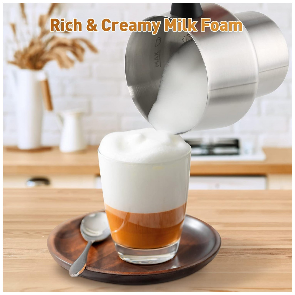 4 em 1 Frator multifuncional para leite Crie espuma de leite densa quente, leite quente, leite com chocolate quente e espuma de leite frio com facilidade. Desfrute de leite com espuma de qualidade barista para cappuccinos, café com leite e chocolate quente em casa. Perfeito para momentos relaxantes e fazer deliciosas bebidas de café.