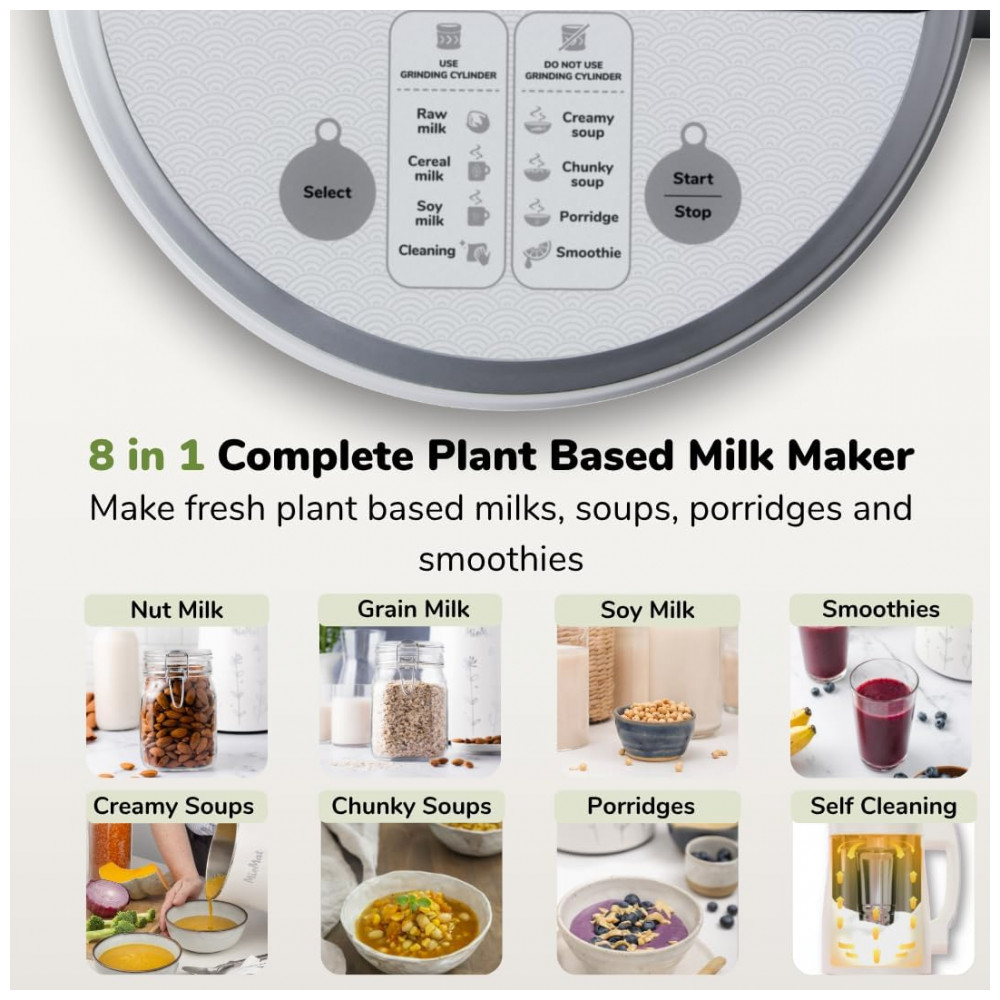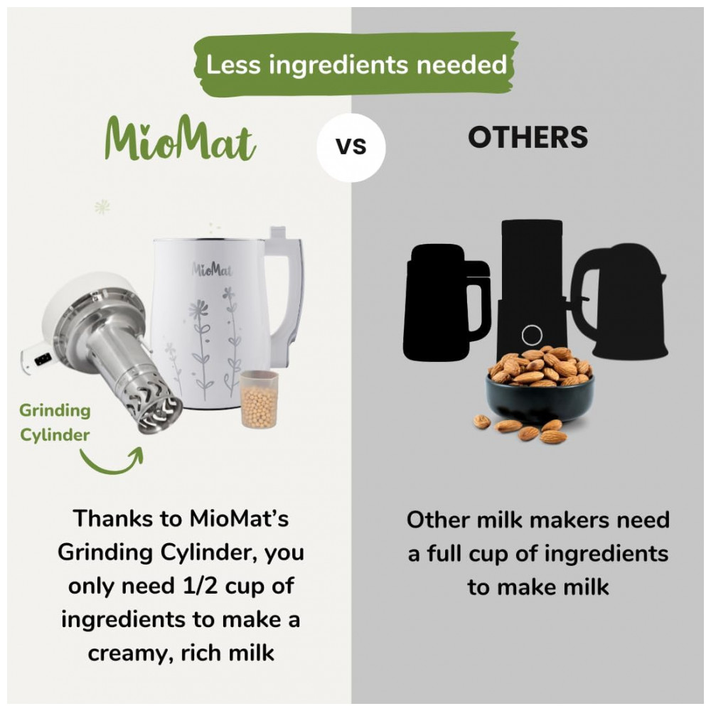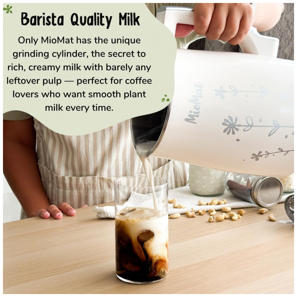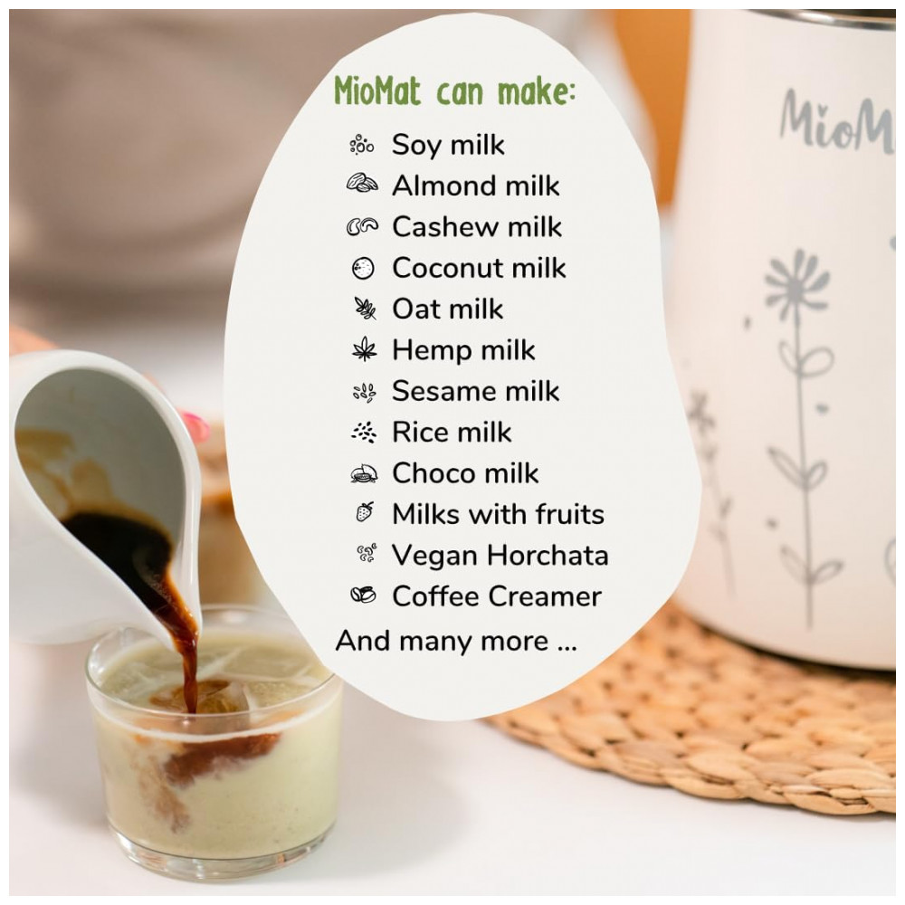 O MioMat pode preparar leite vegano a partir de nozes, sementes, grãos ou mesmo leguminosas. Para citar alguns Leite de Soja, Leite de Amêndoas, Leite de Aveia, Leite de Arroz, Leite de Coco, Leite de Caju, Leite de Amaranto, Leite de Avelã, Leite de Quinoa, Leite de Macadâmia, Leite de Pistache, Leite de Noz, Leite de Batata D, Leite de Noz de Tigre e mais. As possibilidades são realmente infinitas experimente e encontre o seu favorito.