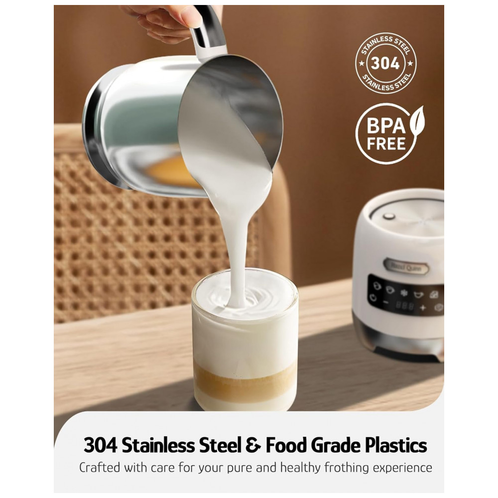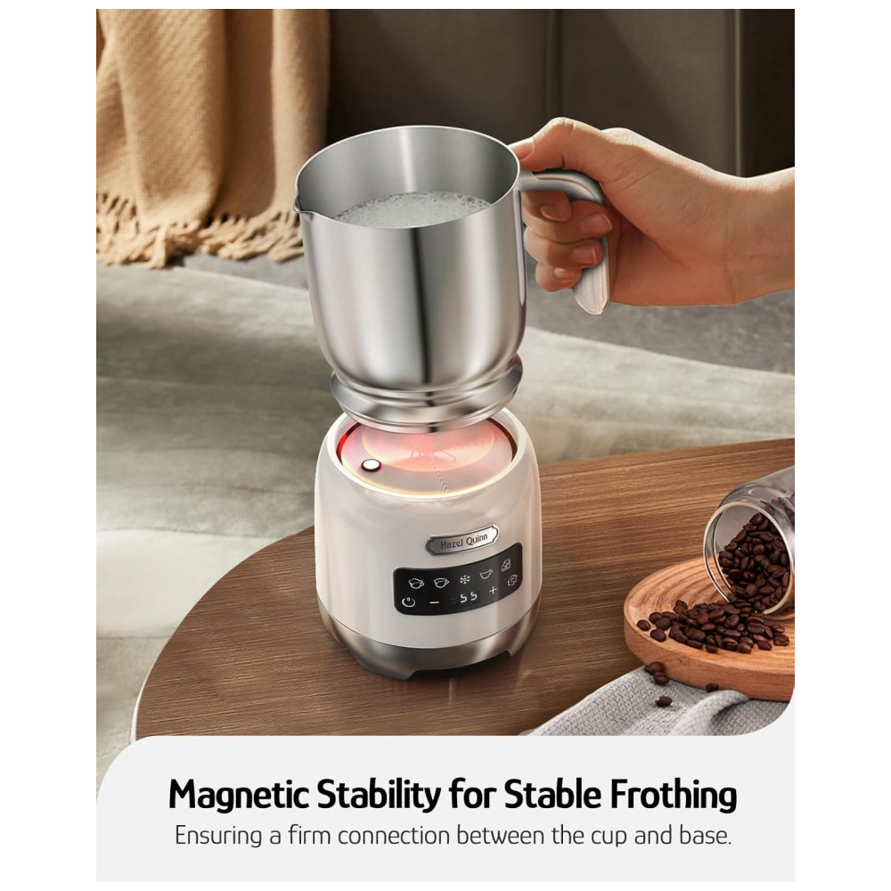 O espumador de leite Hazel Quinn XQP001, na cor branco pérola, é um aparelho elétrico de bancada com jarra destacável em aço inoxidável 304 projetado para aquecer e espumar leite em modos quente e frio. A capacidade máxima é de 400 ml para aquecimento e cerca de 200 ml para formação de espuma, atendendo desde uma caneca de leite aquecido até porções de espuma para cappuccinos e lattes. A base magnética mantém a jarra estável durante o funcionamento e permite remoção rápida para servir e limpar.