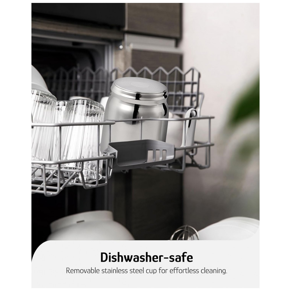 O interior em aço inoxidável 304 evita contato do leite com plásticos, contribuindo para preservar o sabor e facilitar a higienização. A jarra removível é compatível com lava-louças, enquanto a base com ligação elétrica deve ser limpa apenas com pano úmido. Com dimensões aproximadas de 16,0 cm de diâmetro e 22,5 cm de altura, o espumador é adequado para uso doméstico em preparo de cappuccino, latte, chocolate quente e bebidas com leite ou alternativas vegetais.