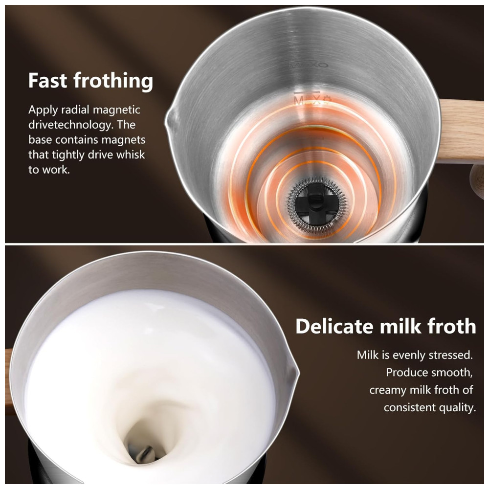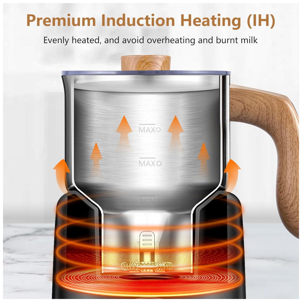 O Espumador de Leite e Aquecedor AMZCHEF 8 em 1 oferece 8 funções em um único aparelho! Com ele, você pode fazer espuma densa, leve, leite quente, chocolate quente, leite com espuma fria, espuma de castanha, soja e até comida de bebê à base de leite. Utilizando indução segura, aquece os ingredientes de maneira envolvente e eficiente, evitando queimaduras e superaquecimento. Com sua tecnologia magnética, produz espuma delicada de forma rápida. Operação simples com um botão, tela OLED moderna e fácil limpeza!