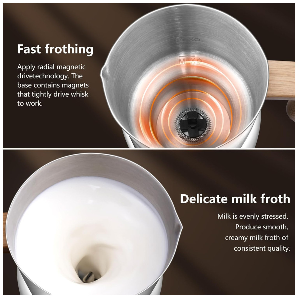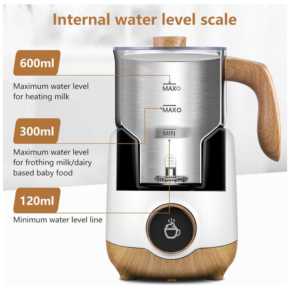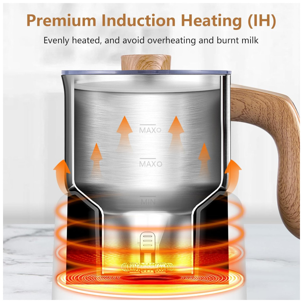 Desfrute de 8 funções em 1 com este vaporizador de leite automático AMZCHEF! Transforme leite em espuma densa, leve, quente, chocolate quente, espuma de leite gelado, espuma de leite de castanha, espuma de leite de soja e comida para bebê à base de laticínios. Com aquecedor de leite automático, você pode preparar seu cappuccino, americano gelado, latte e cacau quente favoritos em casa a qualquer momento. O aquecedor de leite aplica aquecimento por indução seguro, aquecendo os ingredientes de forma envolvente e eficiente, evitando superaquecimento e queima. A tecnologia de acionamento magnético radial cria uma espuma de leite delicada rapidamente. Este vaporizador de leite é fácil de operar com apenas um botão, display OLED moderno e de alta tecnologia, permitindo que você controle facilmente as funções. Fácil de limpar com copo dividido.