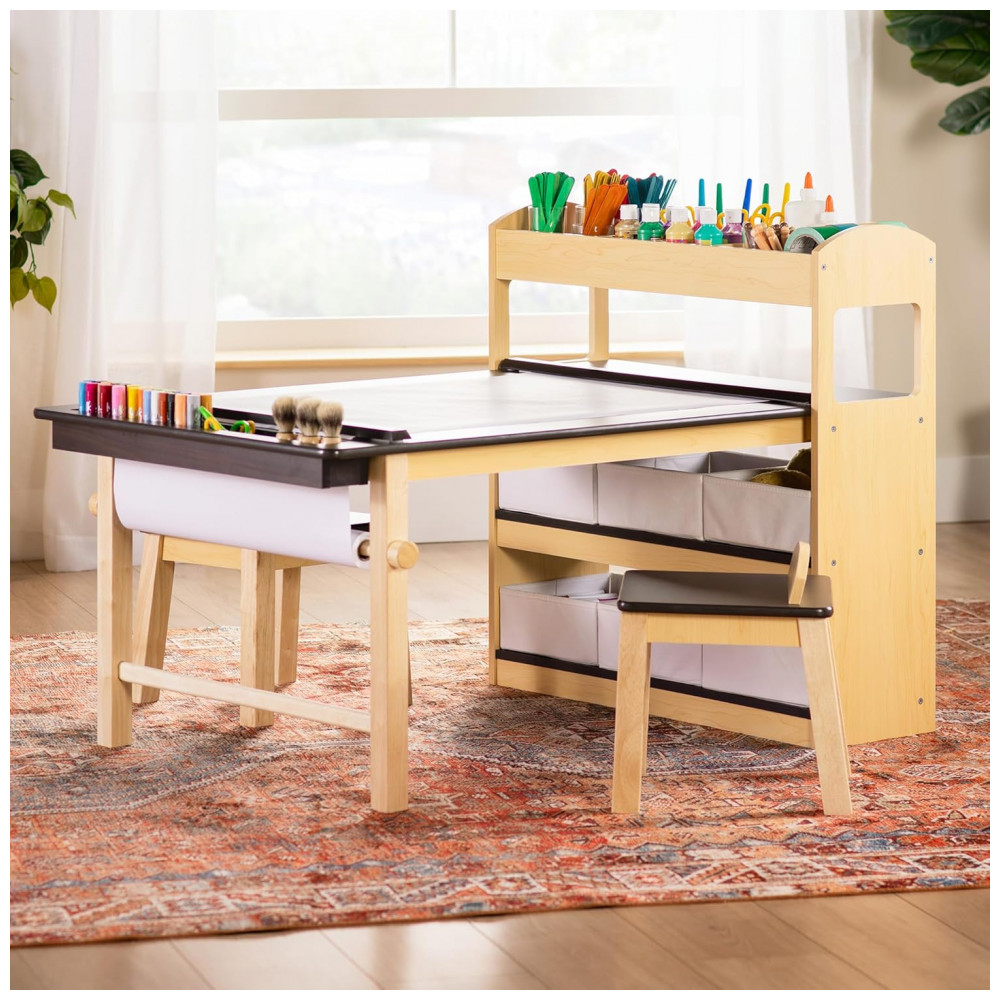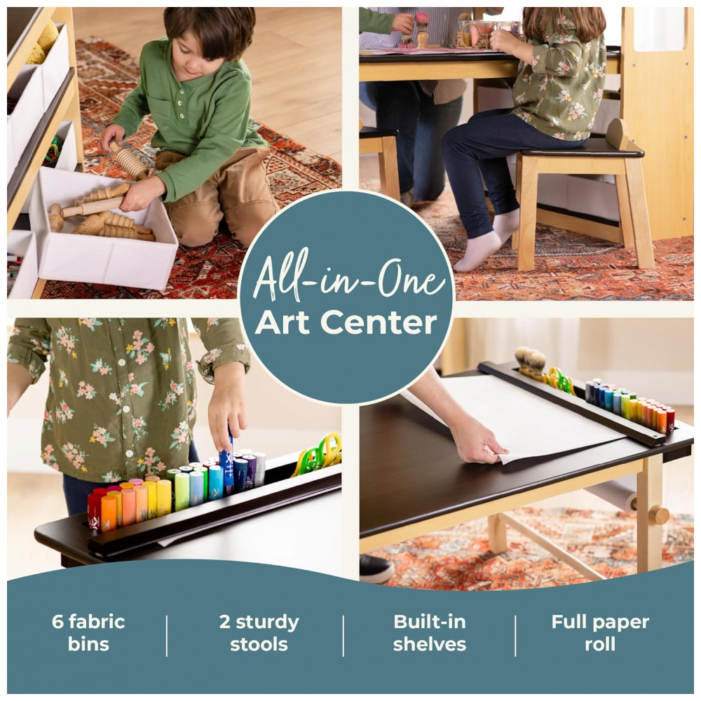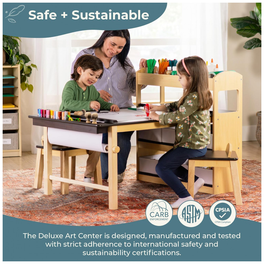 Estação de artes Deluxe Art Center Guidecraft em madeira natural com mesa ampla prateleiras 6 bins e 2 banquetas para desenho e pintura