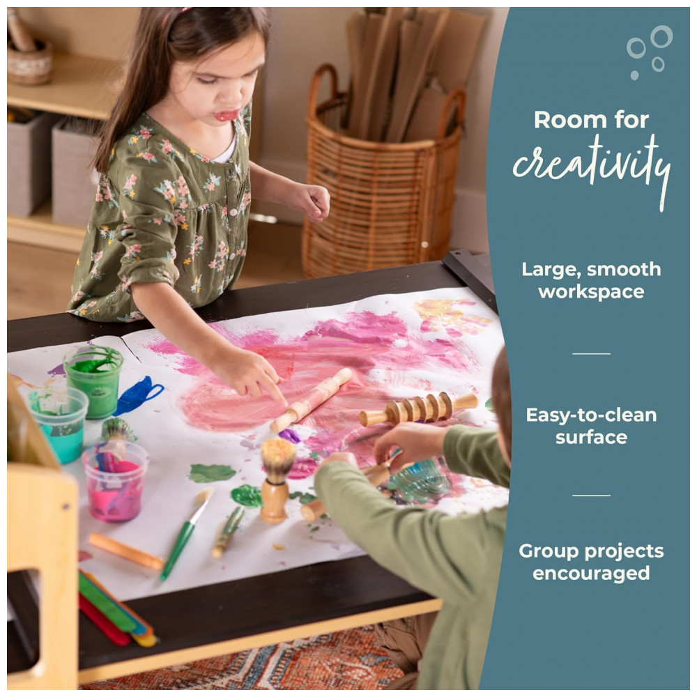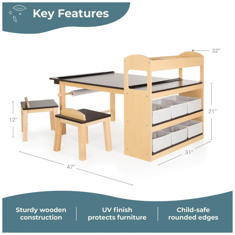 O Guidecraft Deluxe Art Center é uma estação completa de artes e atividades para crianças a partir de 3 anos, combinando uma mesa ampla, prateleiras de armazenamento, suporte para rolo de papel e dois bancos que se acomodam sob o tampo quando não estão em uso. A superfície de trabalho em birch/MDF possui acabamento UV liso e resistente a riscos, com recorte para passagem e organização do rolo de papel, criando um espaço adequado para desenho, pintura, colagem e outros projetos criativos para uma ou mais crianças.