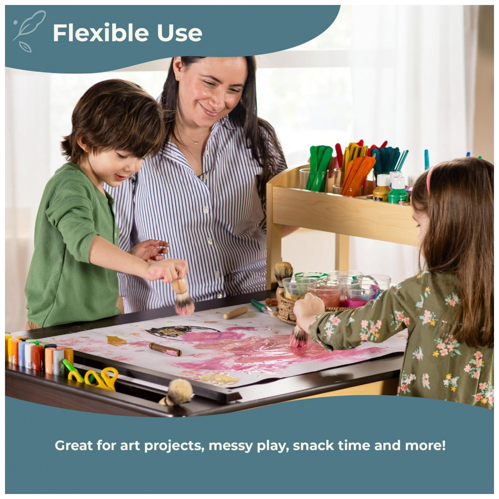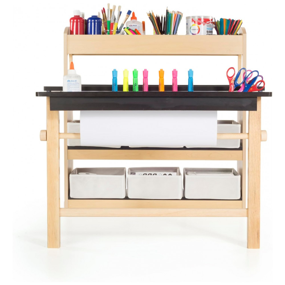 As laterais da mesa reúnem prateleiras abertas e bandejas superiores, enquanto um dos lados acomoda seis bins de tecido que ajudam a organizar tintas, pincéis, lápis, tesouras, papéis e outros materiais de artes. O conjunto inclui o módulo de mesa com armazenagem integrada, dois bancos de madeira com assento de 30cm, seis bins de tecido e um rolo de papel inicial de 18″ x 50′, formando uma solução completa para salas de aula, espaços de homeschooling e brinquedotecas.