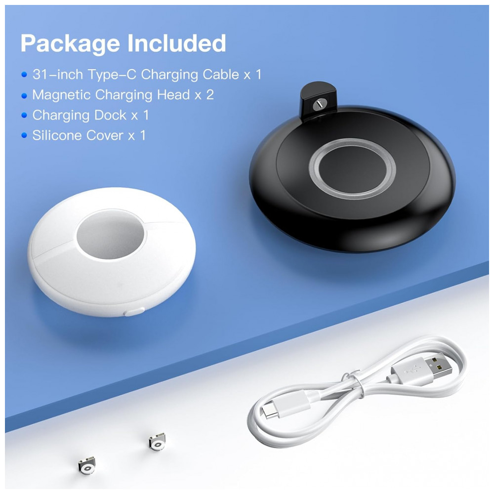 O conjunto inclui cabo USB-C para ligação a fonte de energia compatível com 5V, mantendo uma corrente de carga adequada ao acessório. O formato compacto da base permite posicionamento em mesas, criados-mudos ou estações de jogo, contribuindo para organização dos cabos e reduzindo o risco de quedas do dispositivo durante o carregamento.