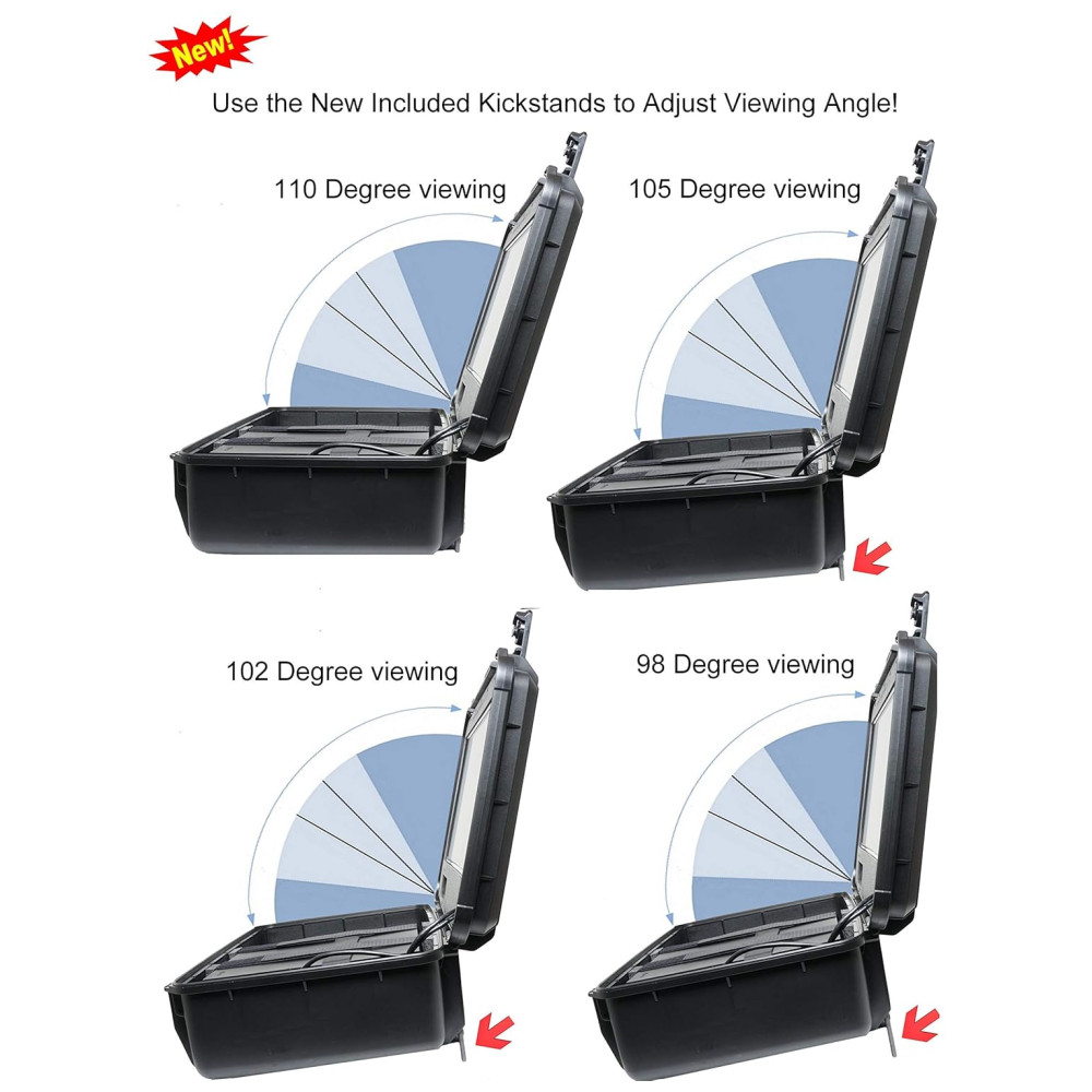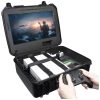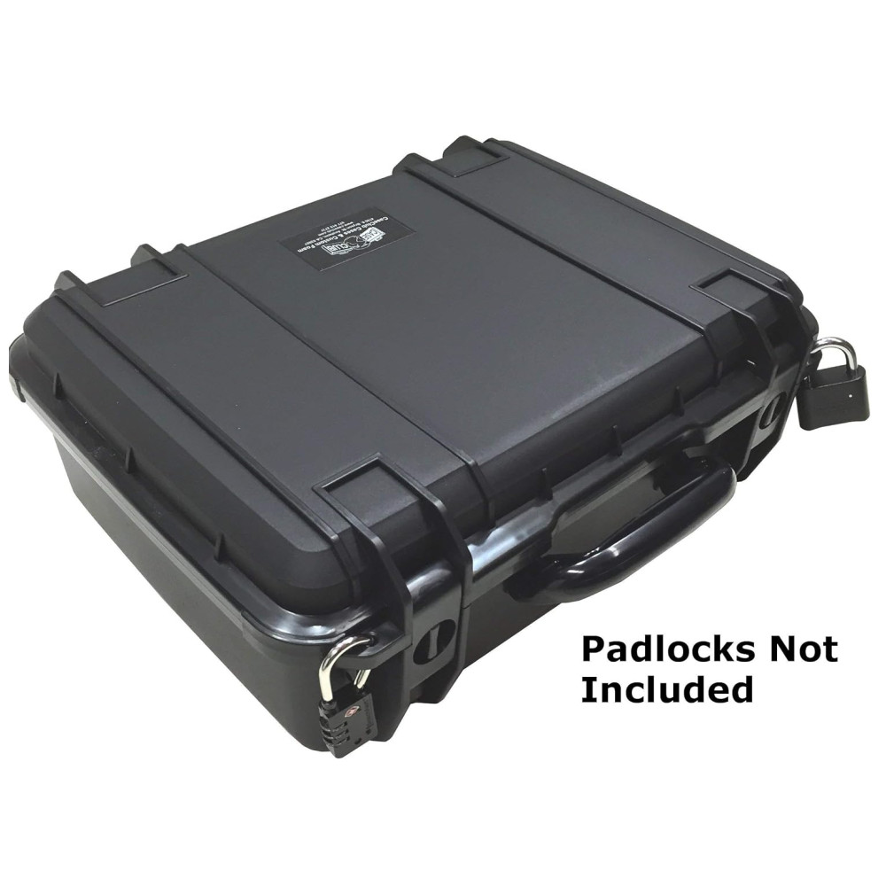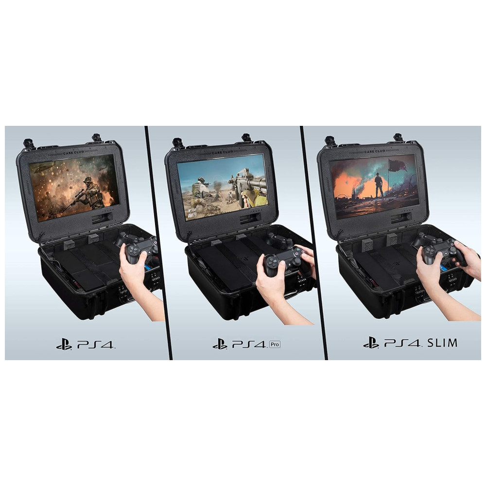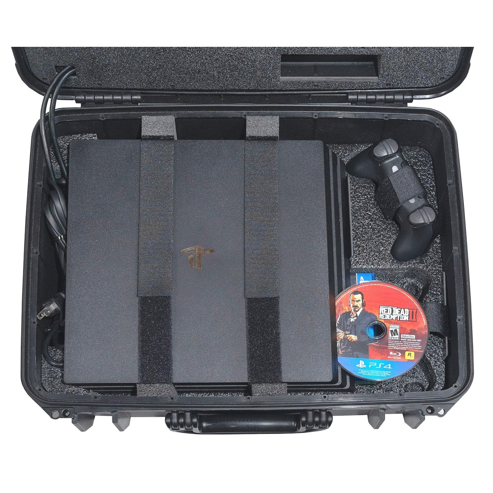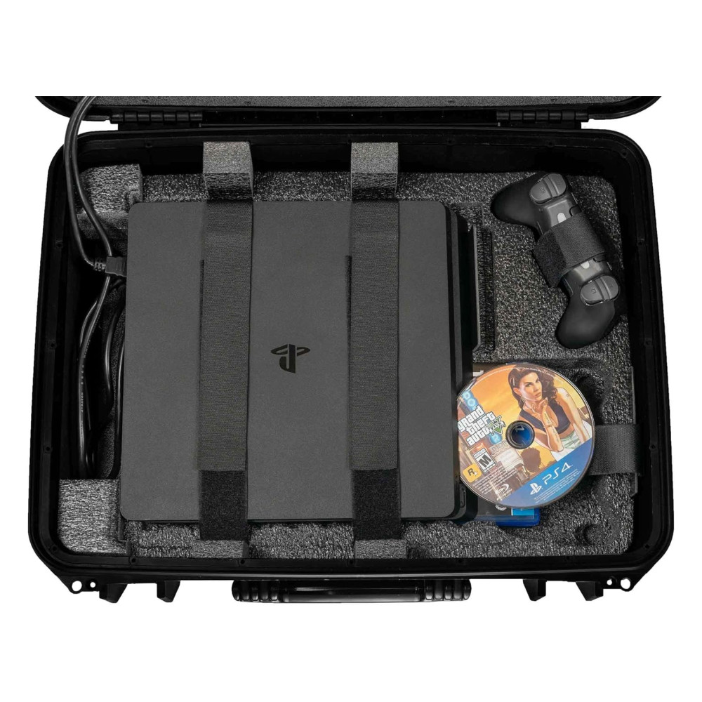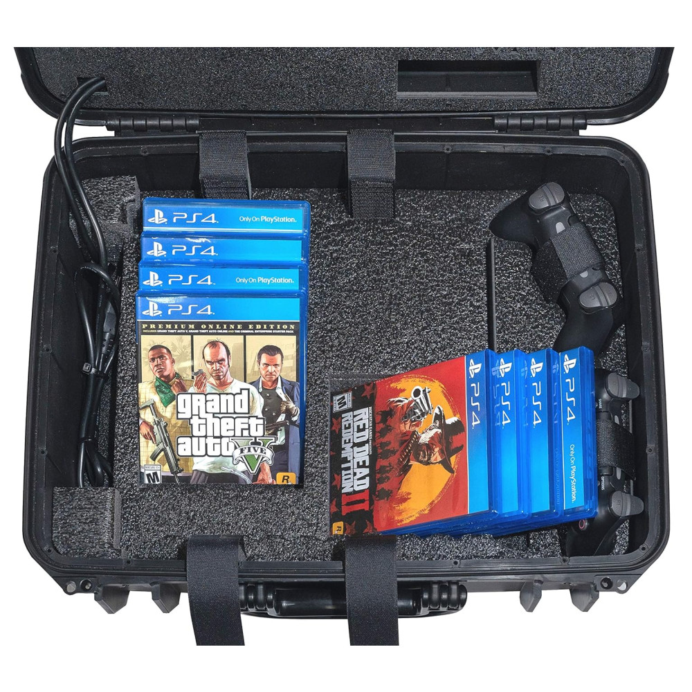 A caixa é impermeável e a prova de poeira e apresenta uma válvula de alívio de pressão, travas de bloqueio de torção, alça reforçada e 2 orifícios de cadeado. A espuma interior é de espuma de polietileno de célula fechada de grau militar equipada para as variações do PS4, 2 controles remotos, 6 estojos de jogos, cabos e acessórios.