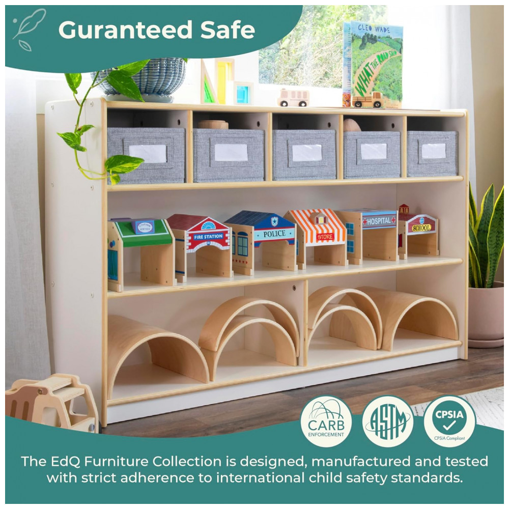A Guidecraft desenvolveu a linha EdQ para atender às necessidades de organização em ambientes de aprendizagem, priorizando móveis em compensado de bétula, duráveis, com design funcional e escala adequada às crianças. A marca tem longa trajetória em mobiliário infantil e brinquedos educativos, com foco em segurança, durabilidade e incentivo à autonomia das crianças na gestão dos próprios materiais.