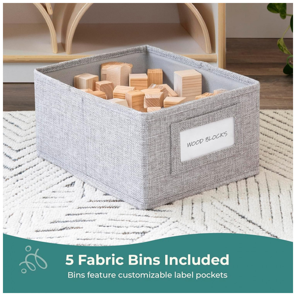 A parte superior oferece 5 nichos alinhados, ideais para caixas, livros de tamanho médio e materiais de uso frequente, enquanto as duas prateleiras inferiores contínuas acomodam jogos em caixa, brinquedos maiores e cestas organizadoras. O produto inclui 5 caixas de tecido que se encaixam nos nichos superiores, com dimensões aproximadas de 20,3cm de largura, 27,9cm de profundidade e 12,7cm de altura cada, facilitando a categorização de materiais.