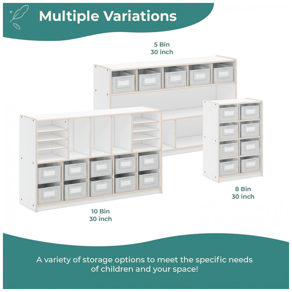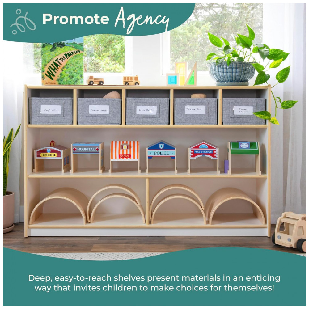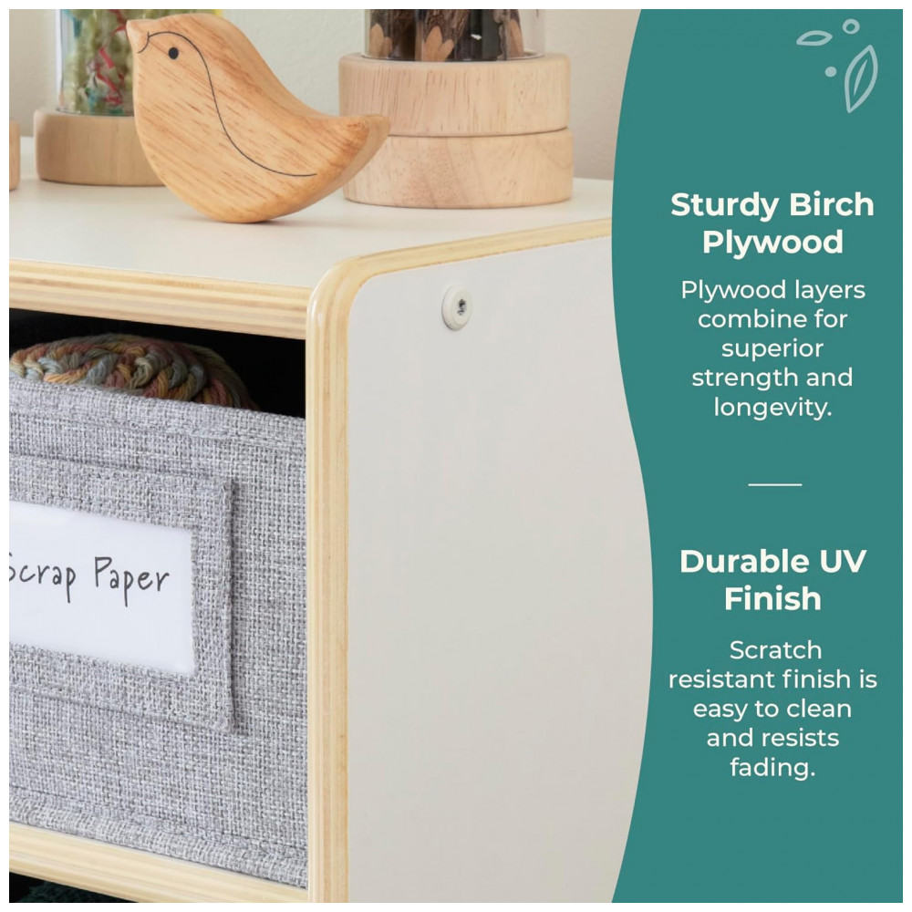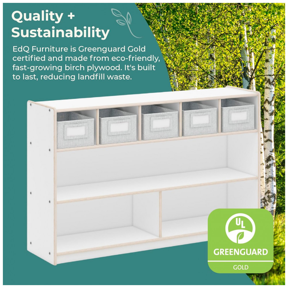 Estante baixa Guidecraft EdQ Shelves and 5 Bin Storage Unit 30″ Branca com 2 prateleiras e 5 nichos com caixas de tecido 122cm
