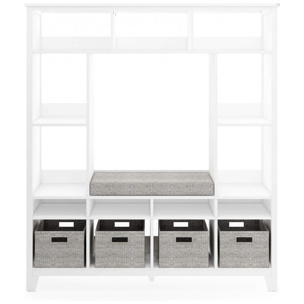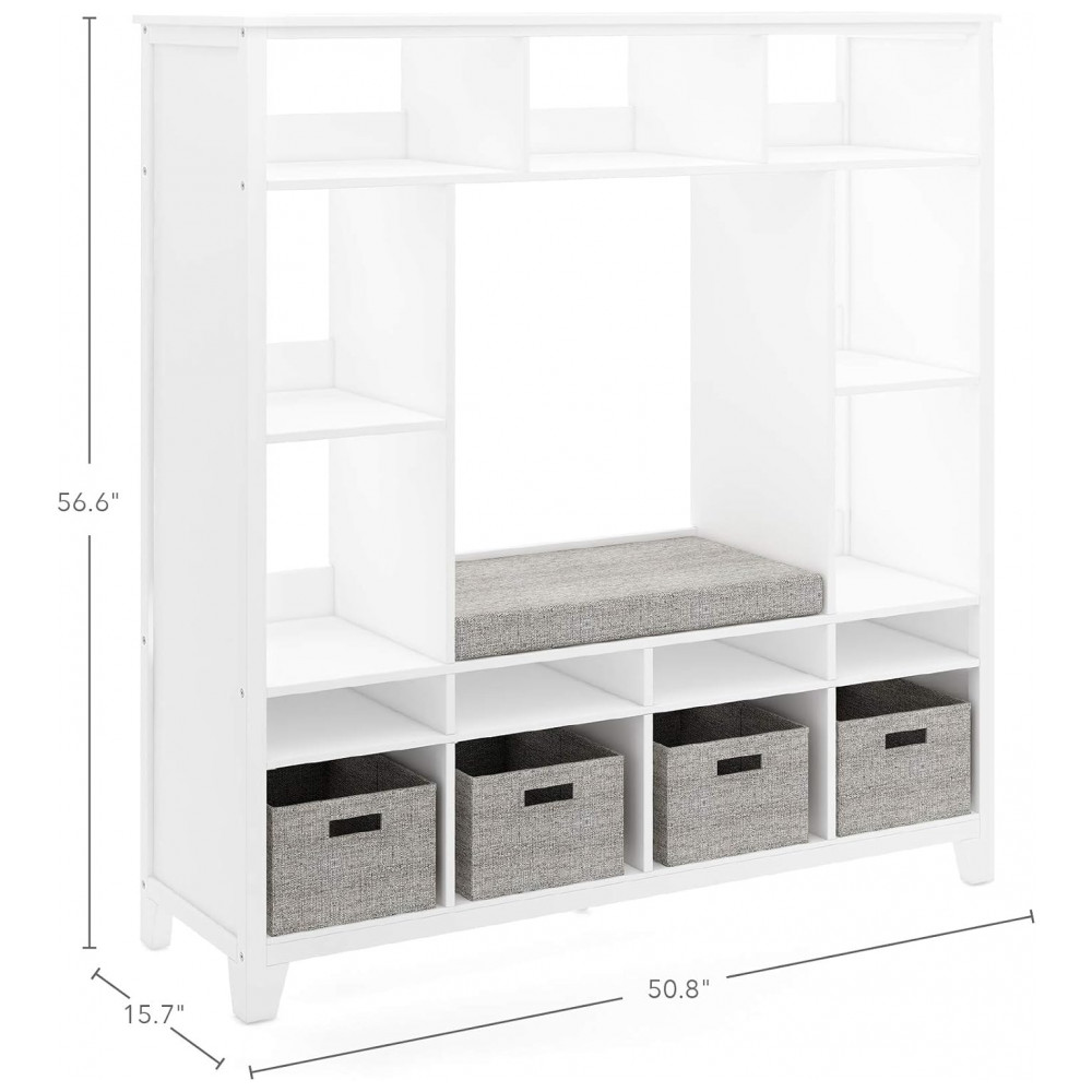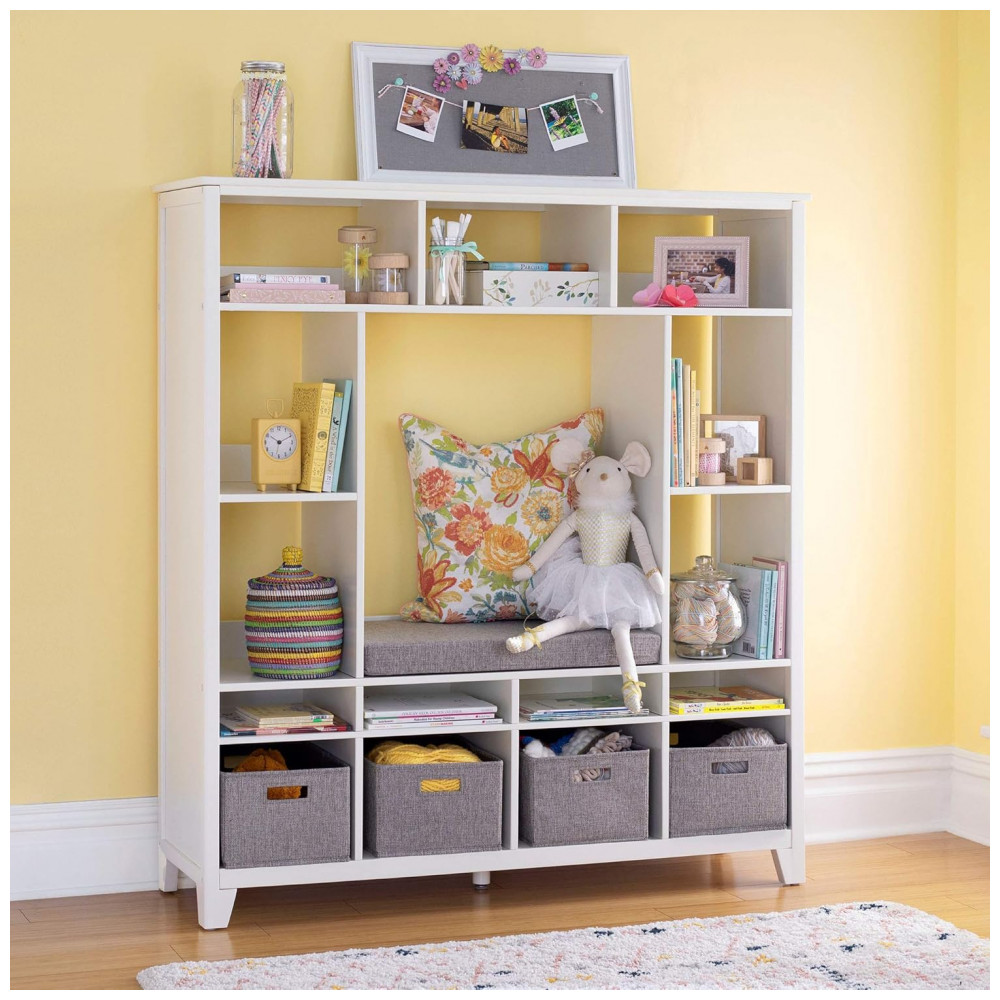 Estante banco infantil Martha Stewart Living & Learning branca com nichos prateleiras e assento acolchoado para quarto infantil